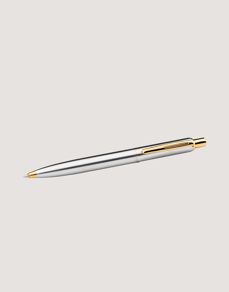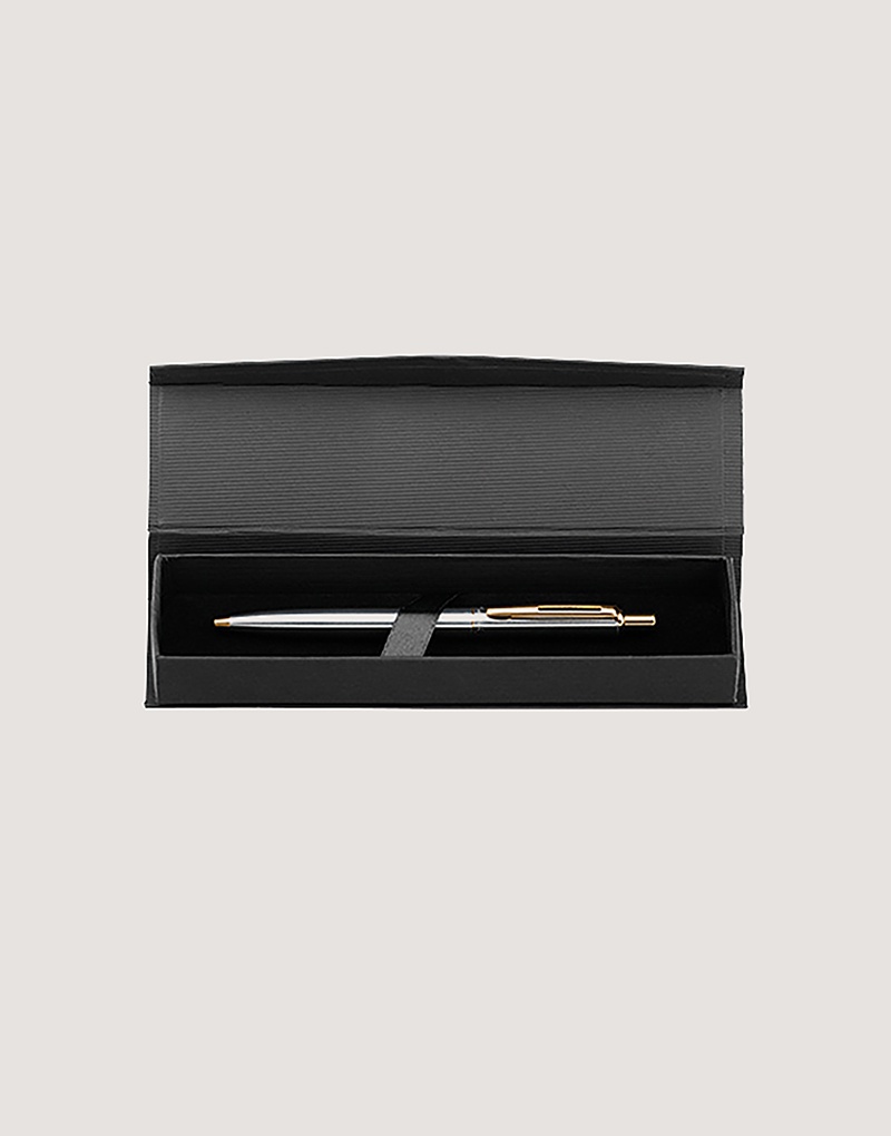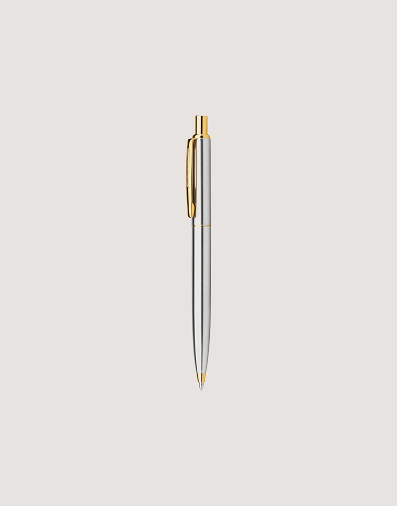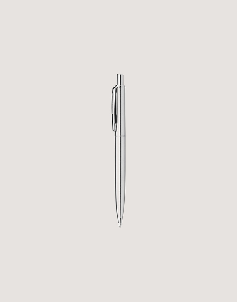 Esferográfica em aço inox com corpo brilhante e clipe de metal. Até 1.5 km de escrita azul. Fornecida em estojo presente desmontado.