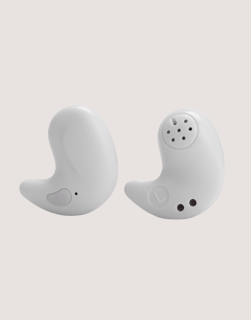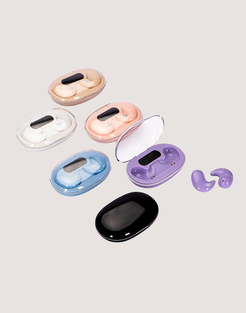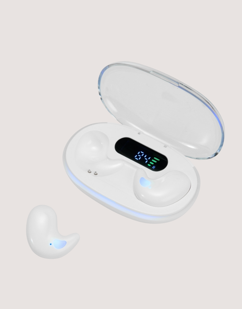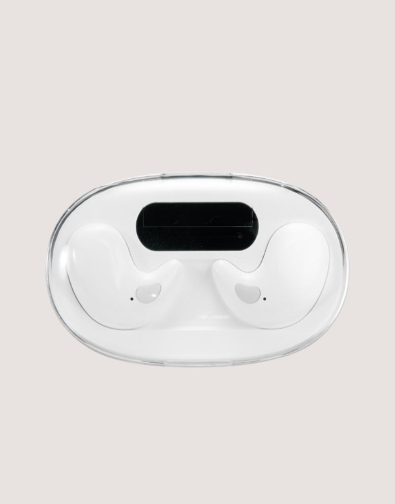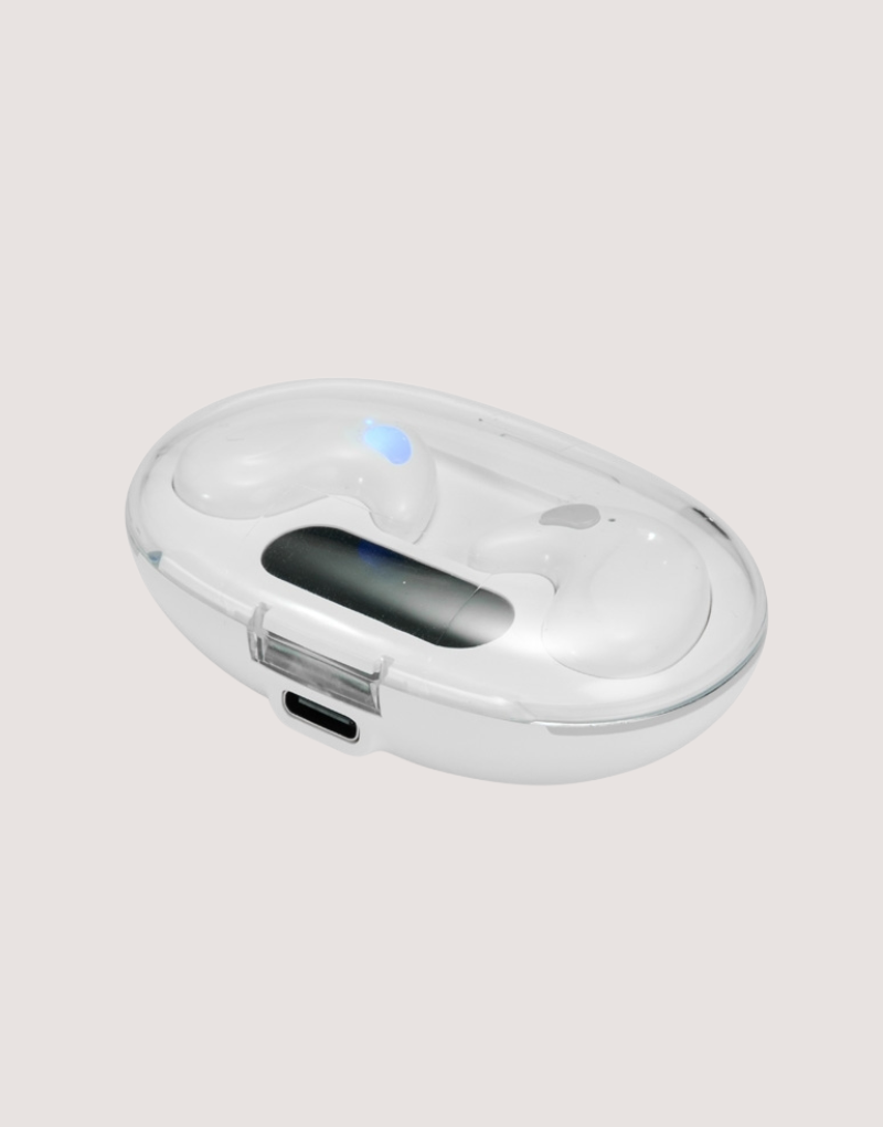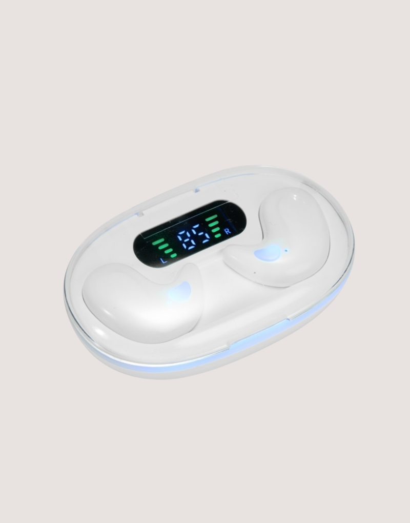 Fones de ouvido intra-auriculares sem fio, com estrutura leve e compacta em plástico e conexão via Bluetooth 5.3, garantindo estabilidade durante o uso. Possui estojo de carregamento com display de LED para visualizar o nível de carga. Acompanha cabo USB-C.