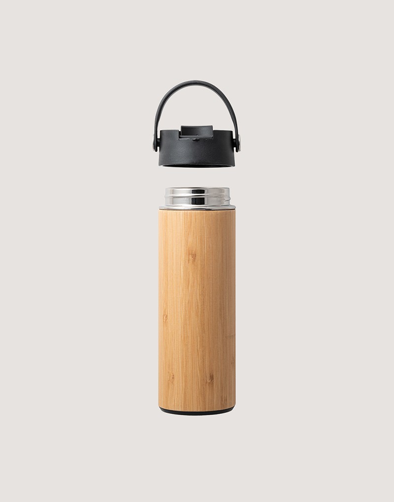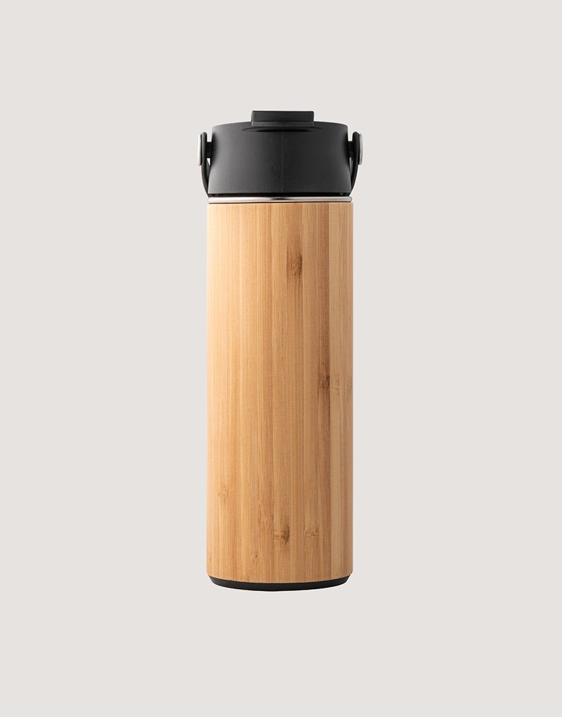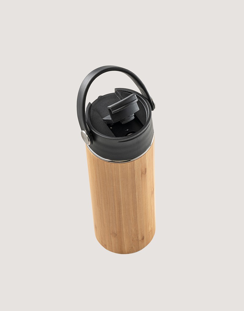 Garrafa em aço inox e bambu de parede dupla térmica, isolada a vácuo. Com tampa em PP com sistema flip top para fácil abertura e alça que facilita o transporte. Capacidade até 440 mL. Preserva as bebidas quentes por 8 horas e as bebidas frias por 24 horas. Fornecido em caixa presente de papel kraft. Certificação EU Food Grade. A cor e o resultado da impressão nos materiais naturais pode variar entre produtos.