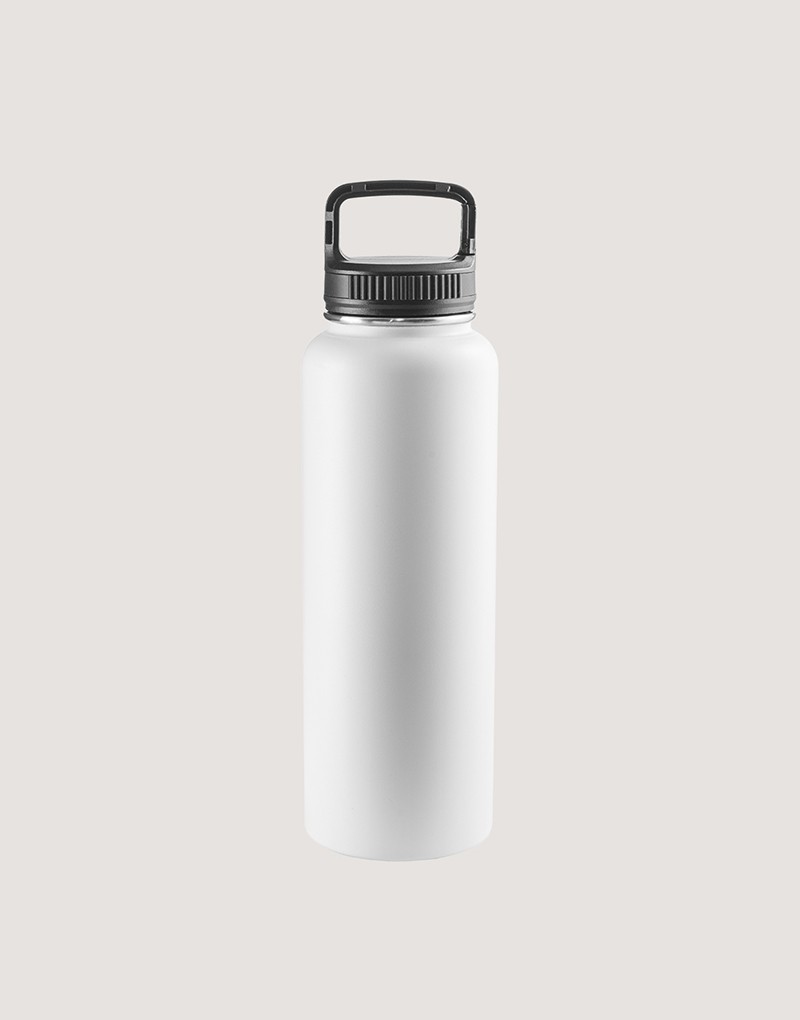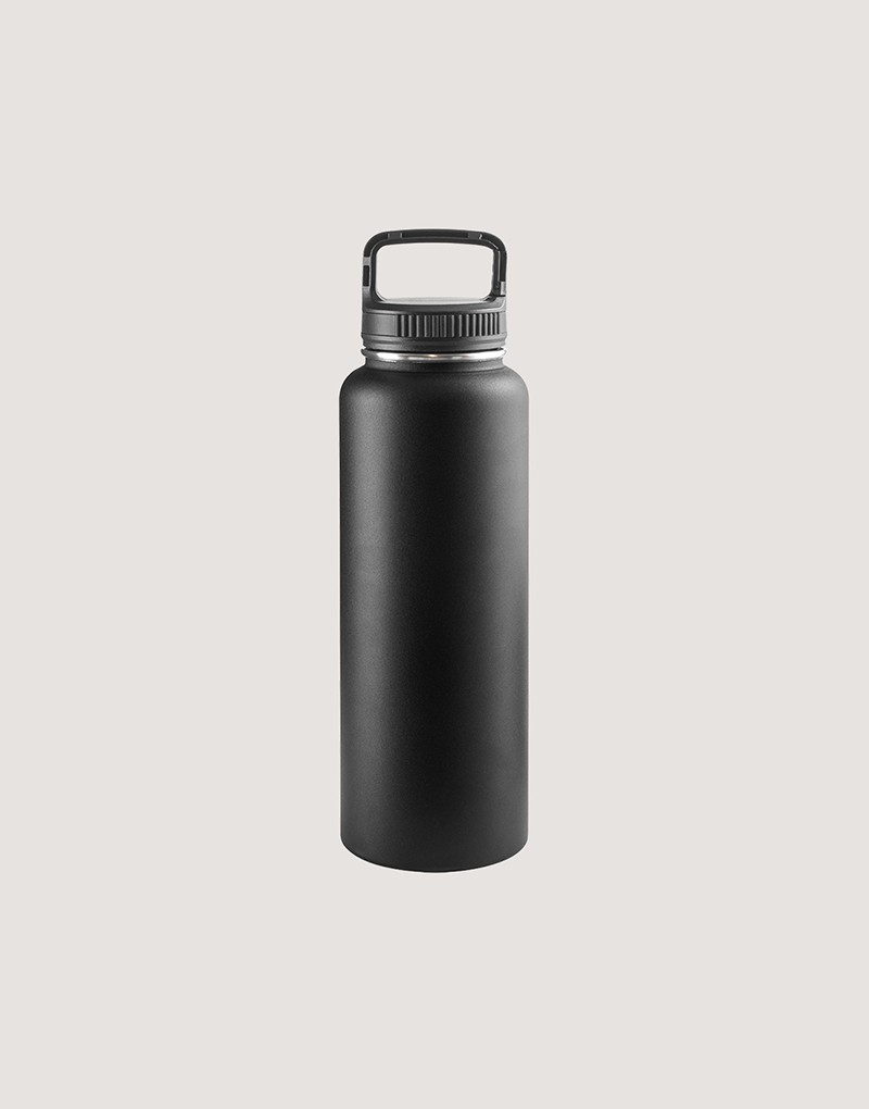 Garrafa esportiva em aço inox (90% reciclado) de parede dupla térmica, isolada a vácuo. Parede com revestimento em pó oferecendo mais durabilidade e resistência. Tampa com pega e um mosquetão que facilitam o transporte. Grande capacidade até 1.2 L. Fornecido em caixa presente de papel kraft. Certificação EU Food Grade.