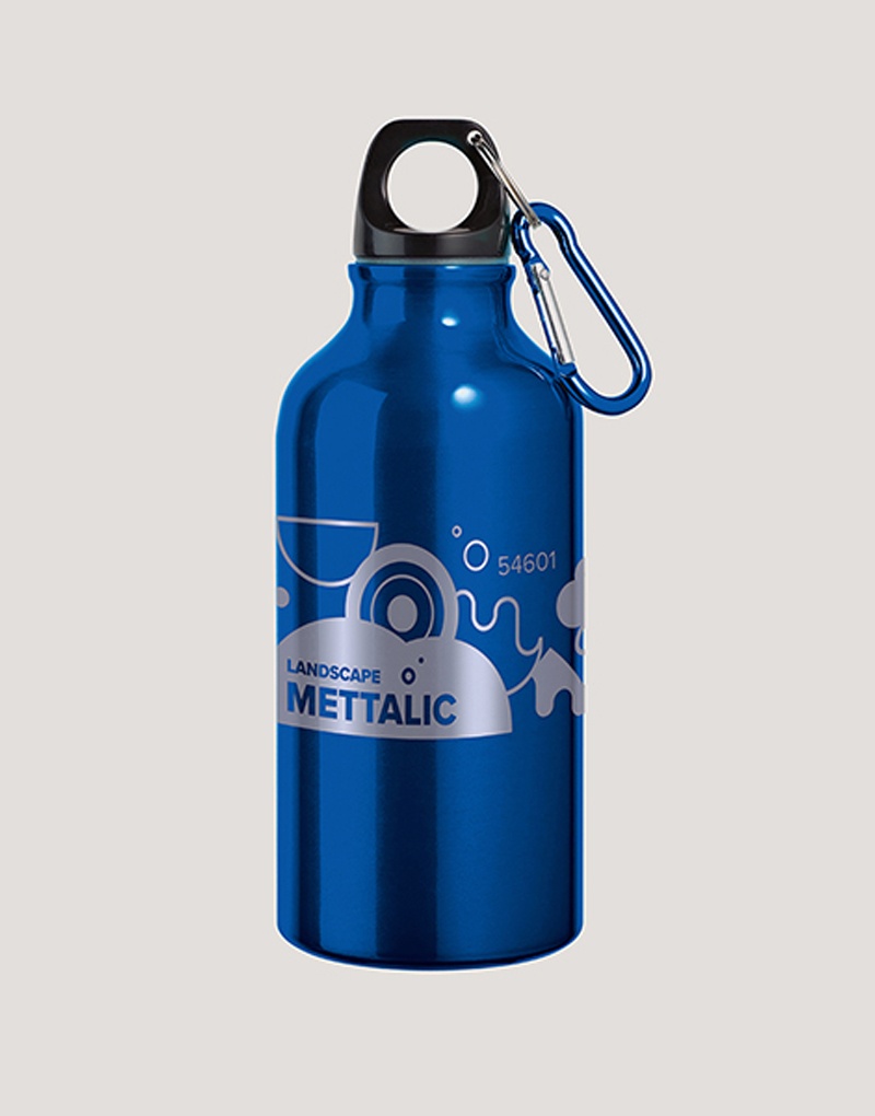 Squeeze esportiva em alumínio com acabamento metálico brilhante, com mosquetão para facilitar o transporte. Capacidade até 400 mL. Caixa branca 94656 vendida opcionalmente. Certificação EU Food Grade.