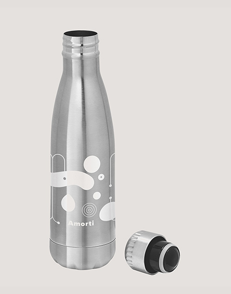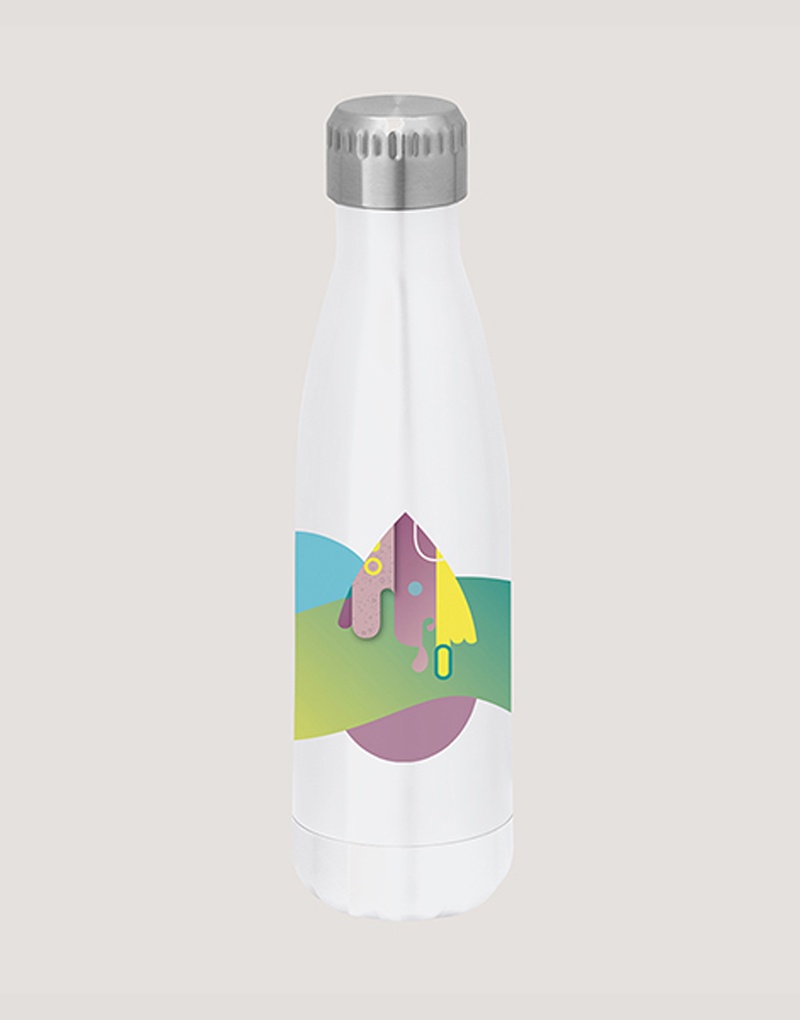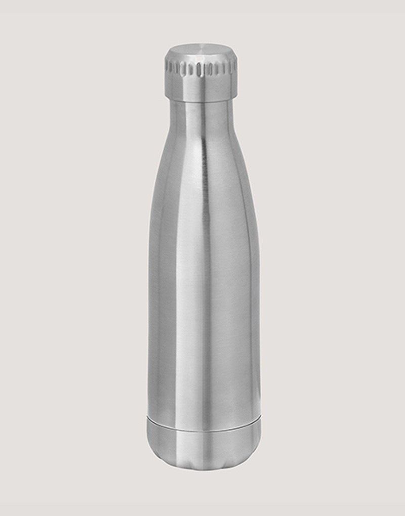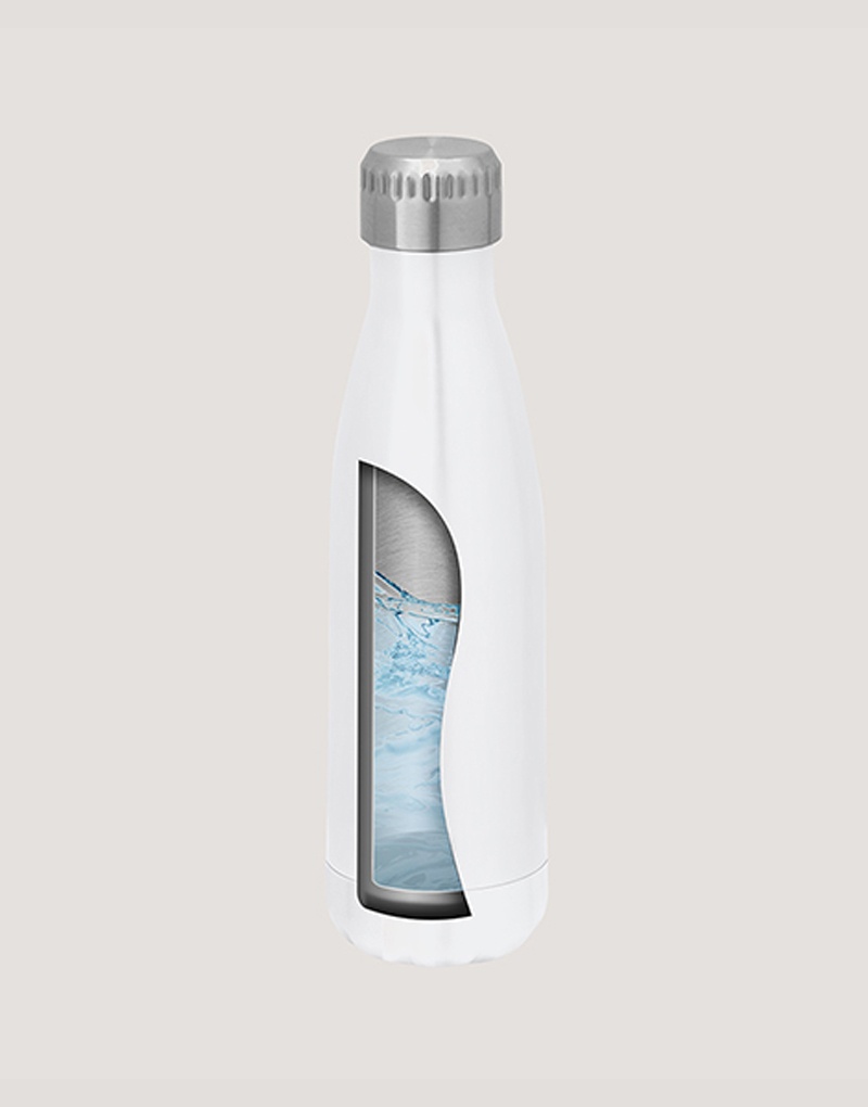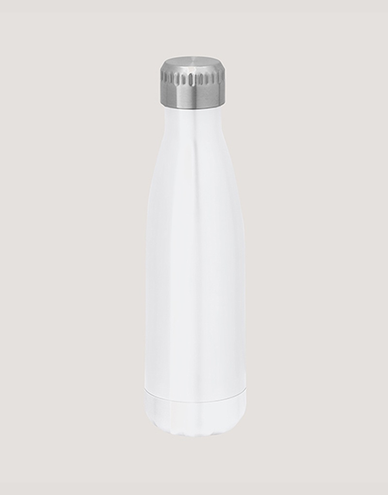 Garrafa para sublimação em aço inox de parede dupla térmica, isolada a vácuo, com tampa em aço inox. Capacidade até 510 mL. Preserva as bebidas quentes por 8h e frias por 24h. Fornecido em caixa branca 94657. Certificação EU Food Grade.