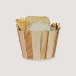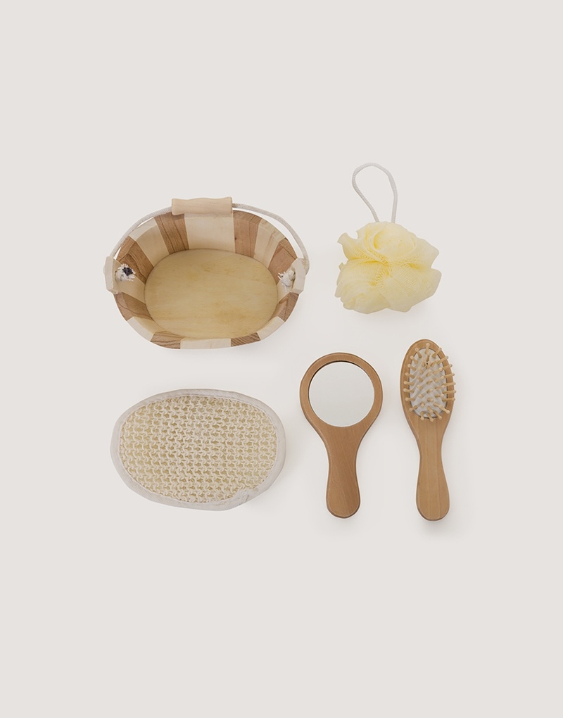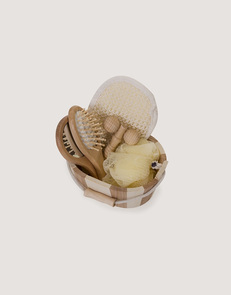Kit banho de madeira com 5 peças. Possui: espelho, escova de cabelo, esponja de banho, bucha de banho e massageador. Acompanha balde com alça e pegador de madeira.