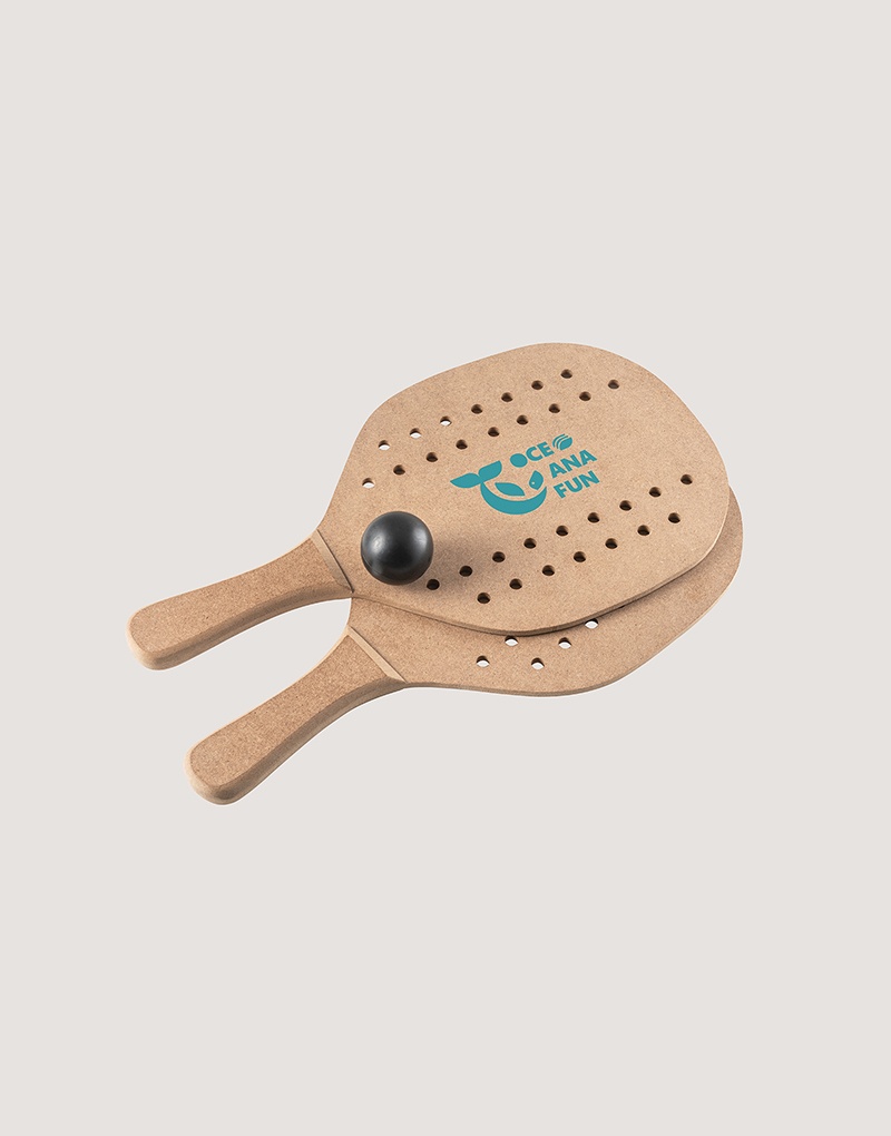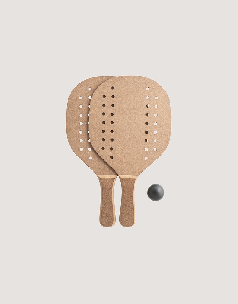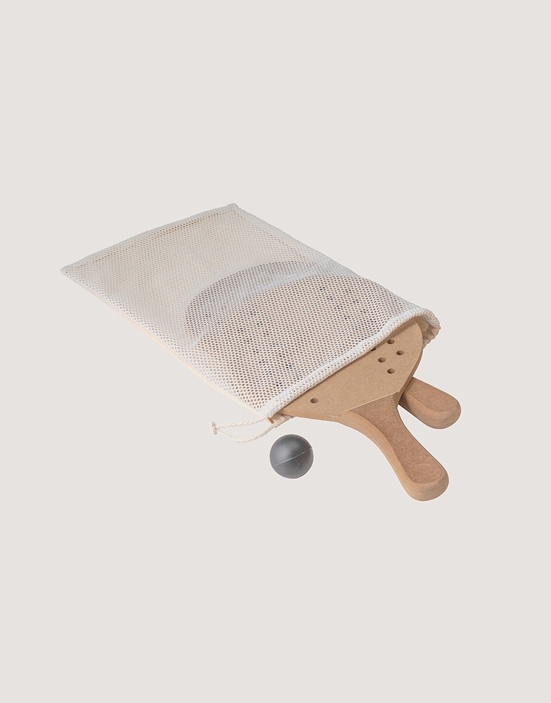 Raquetes de praia em MDF com bola inclusa. Fornecidas individualmente num saco em 100% algodão.