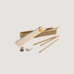 Kit de escrita composto por régua de 16,5 cm, 2 lápis de grafite, 1 borracha e 1 apontador. Fornecido com bolsa em cartão. Produto certificado de acordo com a portaria Inmetro nº423 de 8/out/2021.