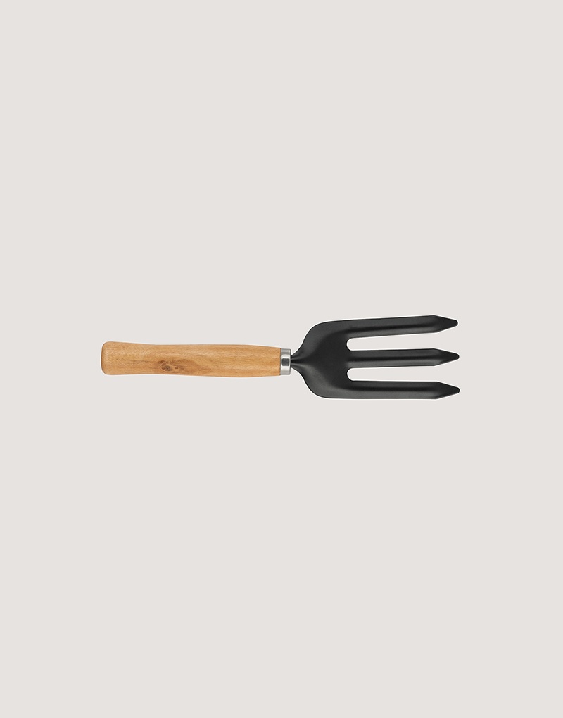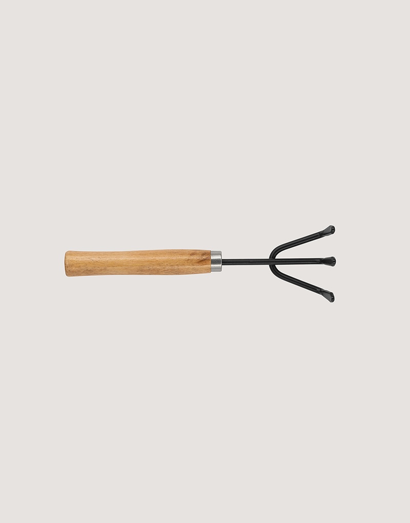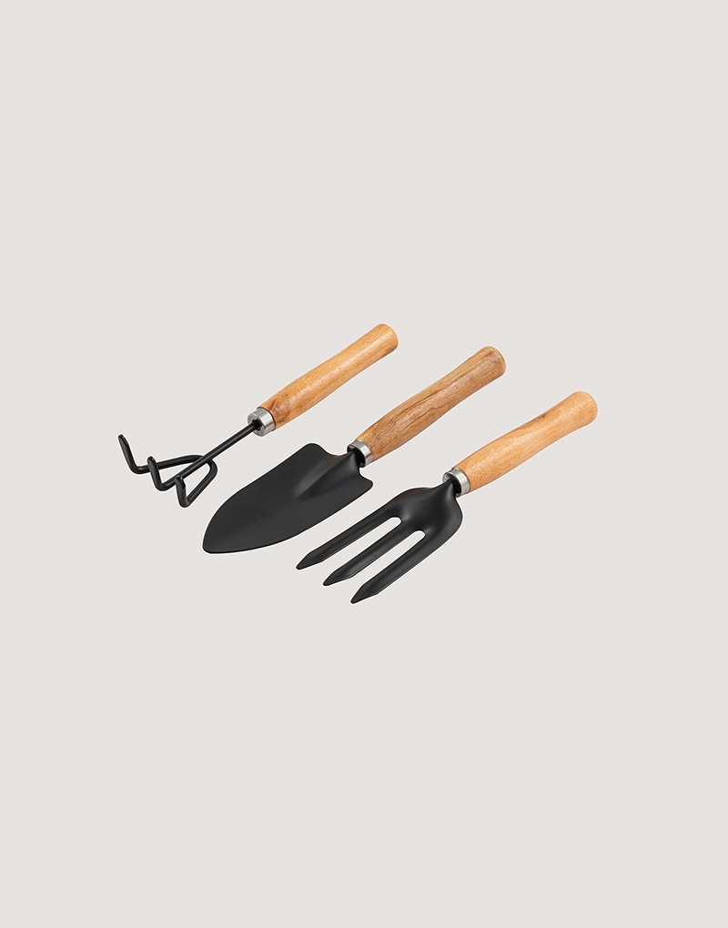 Conjunto de jardinagem com 3 ferramentas em metal e madeira de eucalipto: pá, rastelo e garfo. Incluso bolsa em 100% algodão (180 g/m²) com fita para fechar. Fornecido desmontado.