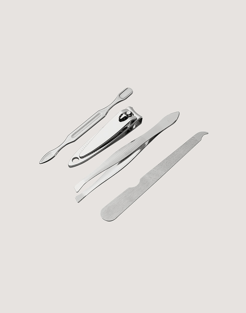 Conjunto de 4 peças para manicure em bolsa de PVC. Composto por lixa, pinça, corta unhas e empurra cutículas.