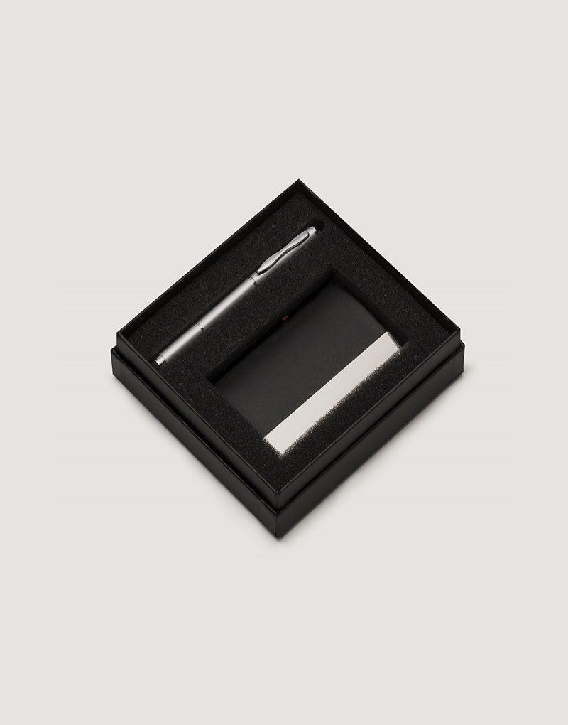 Descrição: Kit executivo com 2 peças em estojo preto de papelão revestido com espuma interna. Possui uma caneta metal esfero laser e lanterna, clip metal e ao lado desenhos indicativos referente as funções, contém dois anéis prata, sendo o primeiro ao desrosquear fica o compartimento das baterias(acompanha 3 baterias CNB G3A) e o segundo anel é uma tampa com ponta touch, basta puxá-la para utilizar a caneta esfero. Porta cartão em couro sintético com detalhes em metal espelhado, parte interna revestida com veludo.