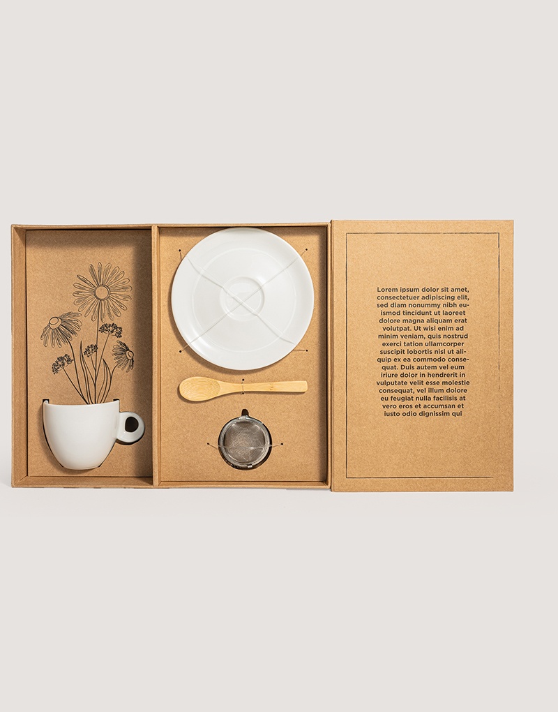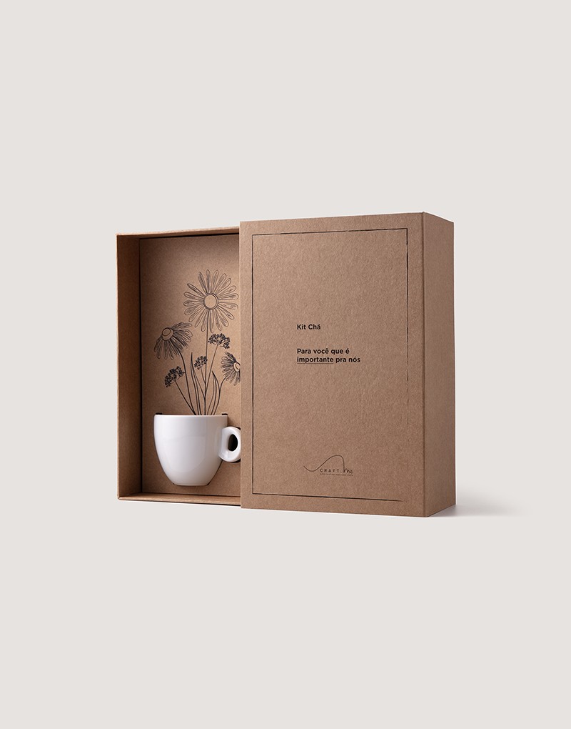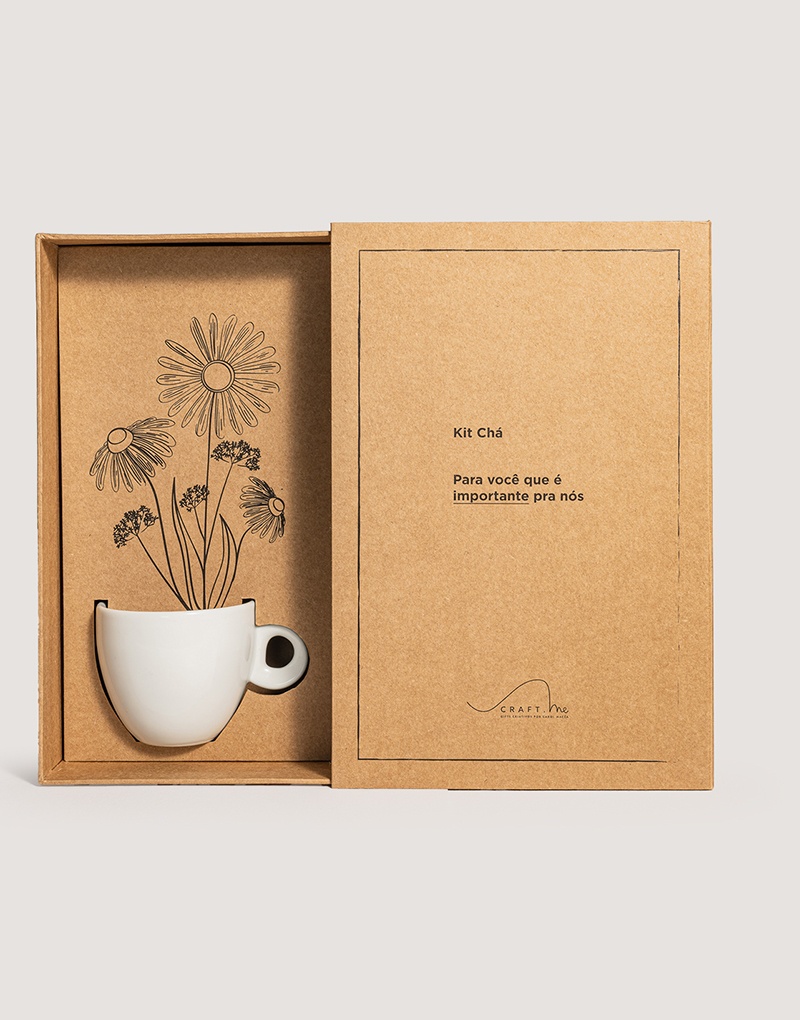 O Kit Presente Chá é uma pausa embalada com cuidado. Composto por caneca, pires, colher e um infusor de chá, ele convida quem recebe a desacelerar, respirar e se cuidar. A ilustração floral no interior da caixa completa a experiência sensorial, transformando o momento em ritual.