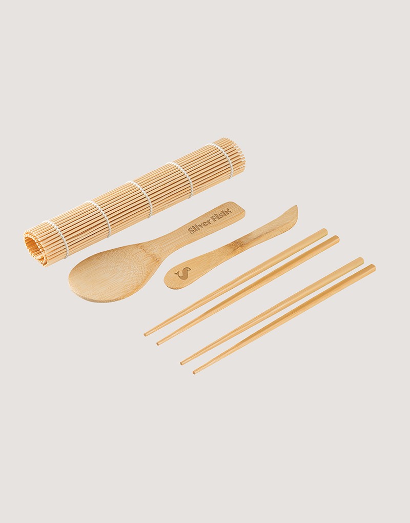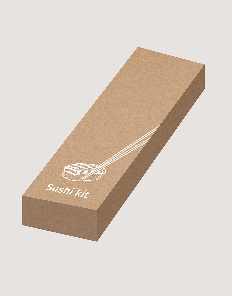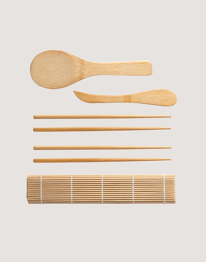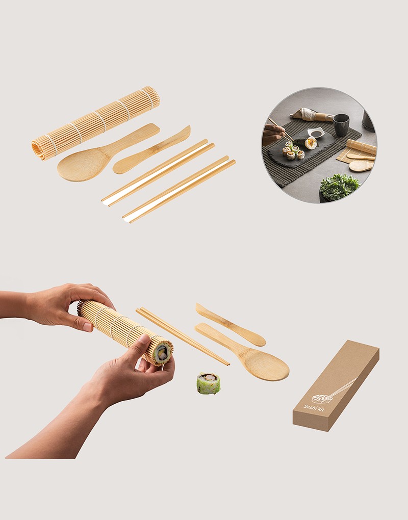 Kit para sushi em bambu com tapete, 2 pares de hashi, 1 colher e 1 faca em bambu. Fornecido em caixa presente de papel kraft reciclado. A cor e o resultado da impressão nos materiais naturais pode variar entre produtos.