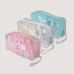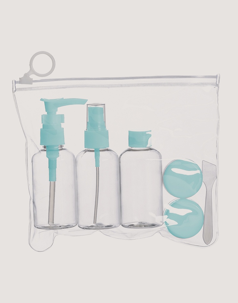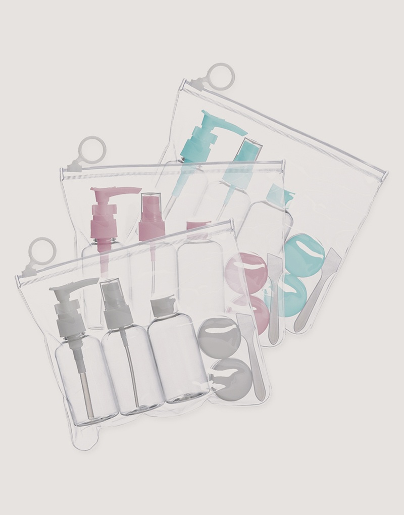 Descrição: Kit viagem 6 peças em estojo ziplock. Contém frasco de 80ml com tampa spray; frasco de 80ml com tampa rosqueável; frasco de 80 ml com tampa pump; 2 potes de 10ml com tampa rosqueável e mini espátula fosca. Frascos plásticos e estojo em pvc com puxador plástico.