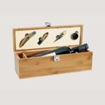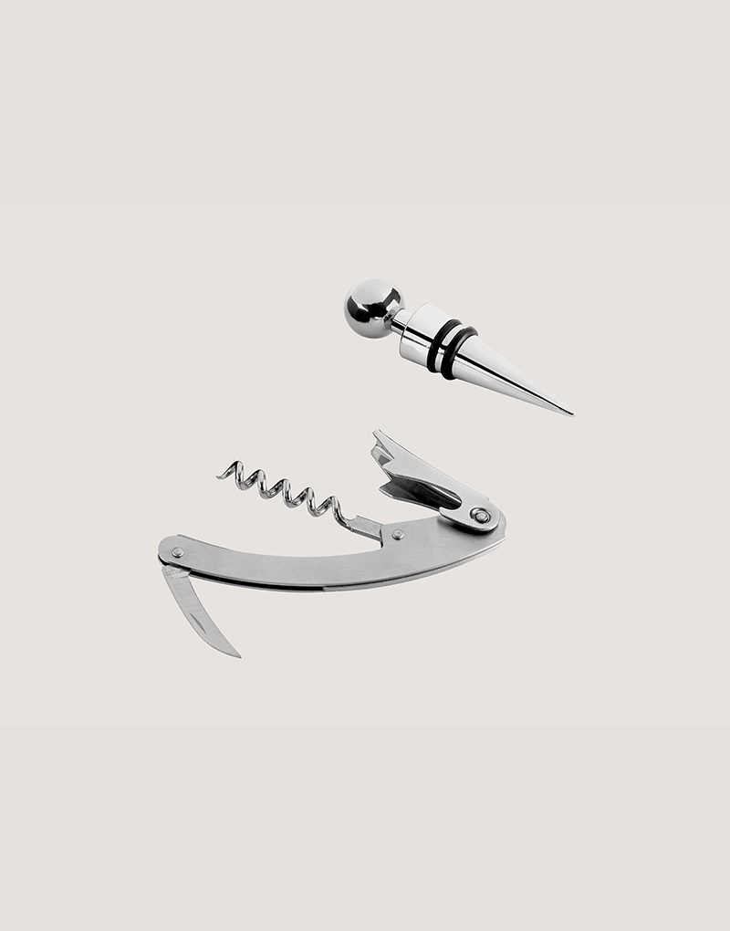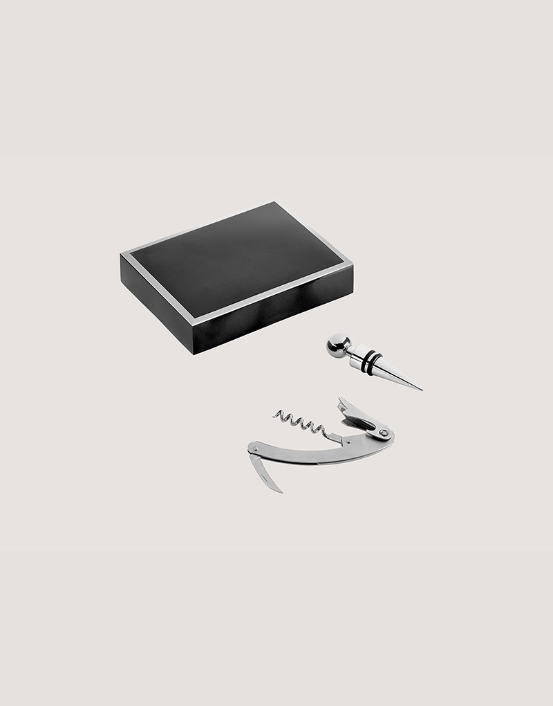 Conjunto para vinho em zinco. Incluso saca-rolhas com canivete de sommelier e rolha. Fornecido em caixa presente.