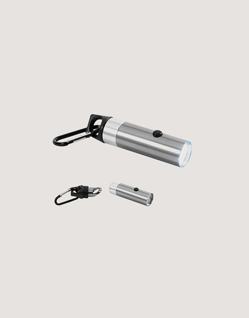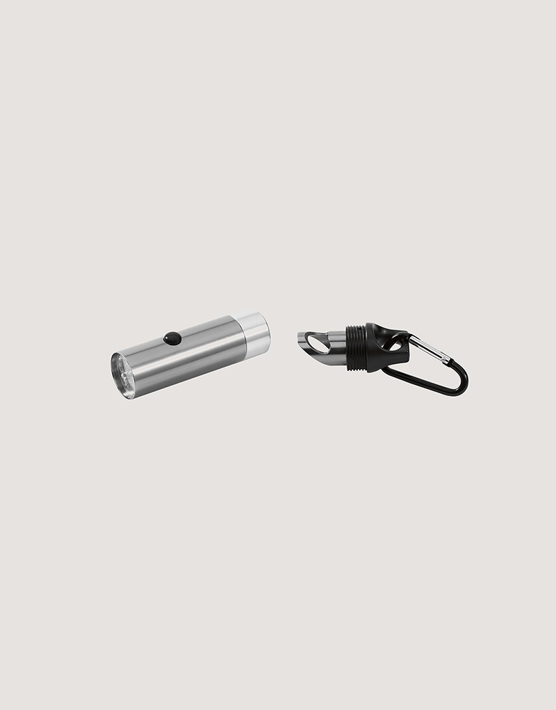 Lanterna em alumínio com 6 LEDs, abridor de garrafas e mosquetão. Incluso 2 pilhas CR2032.