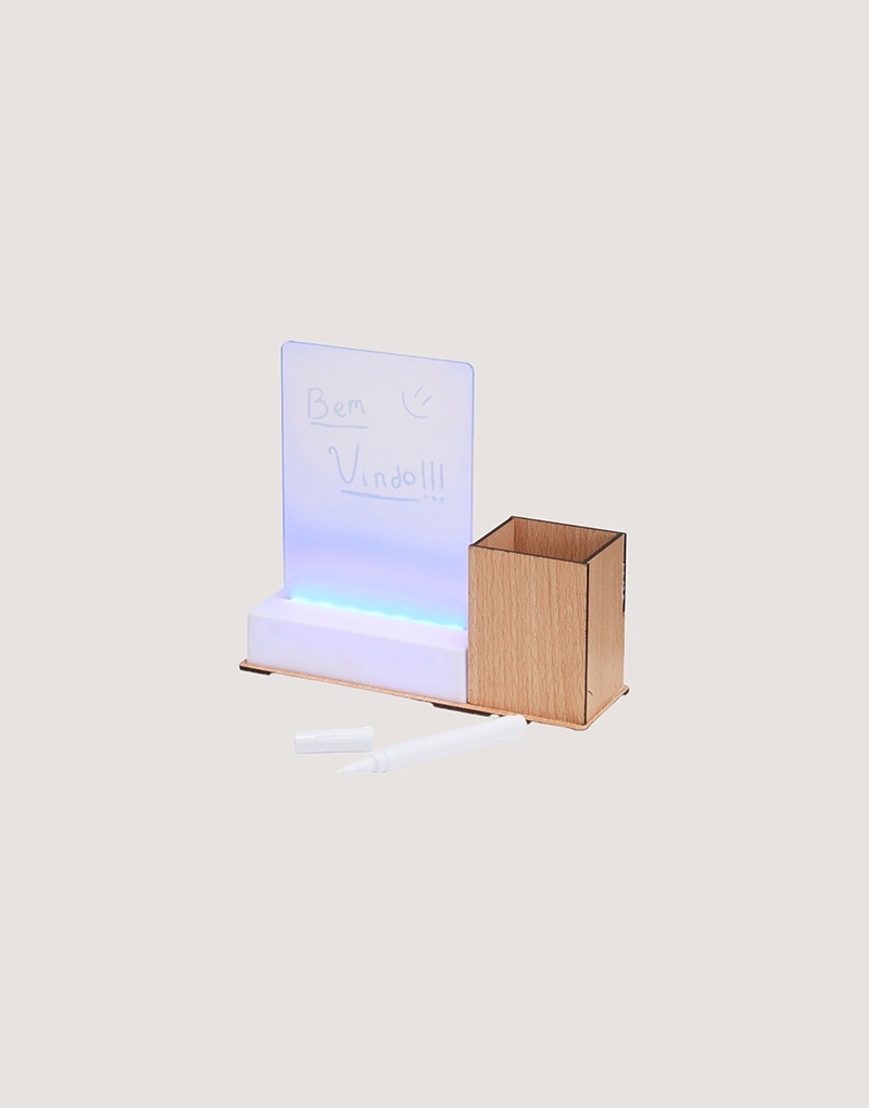 Descrição: Moderno e funcional, este quadro de mensagens em LED é ideal para anotações e comunicações dinâmicas. Possui estrutura plástica com base em MDF e porta-caneta integrado, fazendo com que seja estável e prático para o dia a dia. Funciona via conexão USB (fonte não inclusa) ou com 3 pilhas AAA, tornando seu uso versátil. Acompanha caneta plástica com carga de giz líquido, permitindo escritas nítidas e fáceis de apagar com pano ou papel.