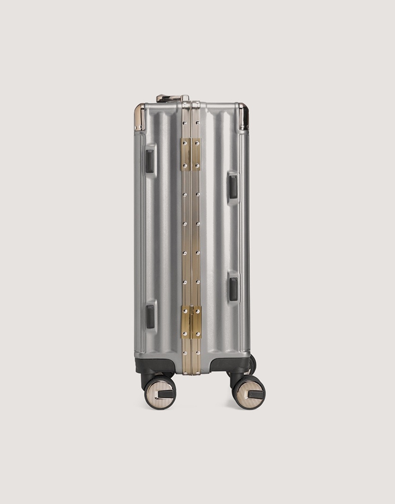 Descrição: Mala de viagem 38 litros feita em plástico com acabamento em alumínio, contém cadeado numérico TSA. Compartimentos internos com bolso telado, bolso plástico para itens molhados e cinta compressora para roupas. A mala possui duas alças de mãos, puxador retrátil com regulagem de tamanho, suporte porta bolsa, quatro rodinhas 360º e apoios laterais.