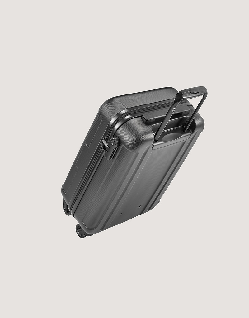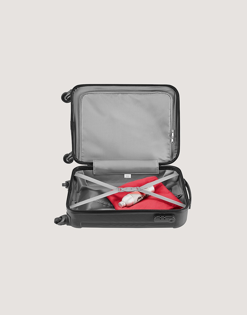 Mala de viagem executivo em ABS com interior forrado, com divisória. Fecho de segurança com senha na lateral, 4 rodas giratórias, pega extensível em alumínio, com mola (altura da pega estendida até 500 mm), e placa metálica removível com imã para fácil gravação. Mala com capacidade até 31 L e peso de 2,25 kg.