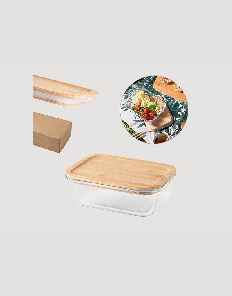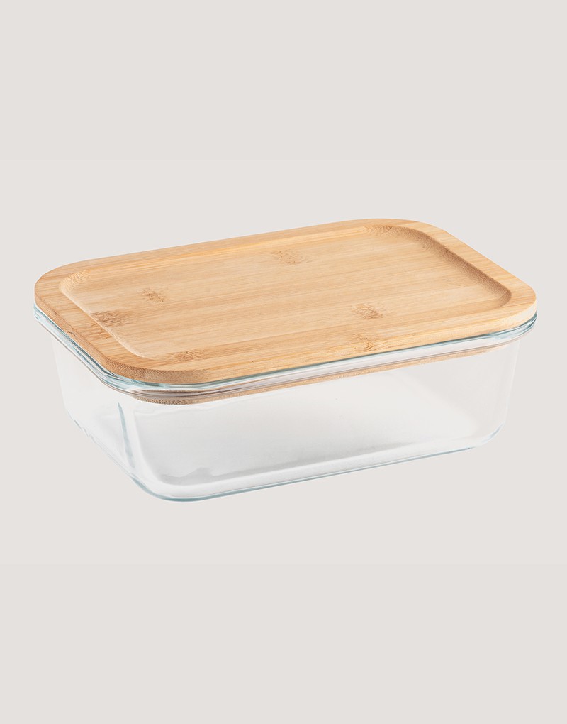 Marmita em vidro borossilicato e tampa em bambu com vedante em silicone. Apto para o micro-ondas e máquina de lavar, retirando a tampa. Capacidade até 1 L. Fornecida em caixa presente de papel kraft reciclado. Certificação EU Food Grade. A cor e o resultado da impressão nos materiais naturais pode variar entre produtos.
