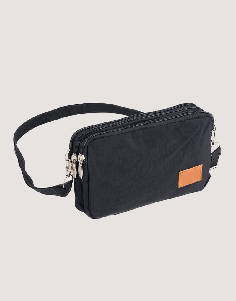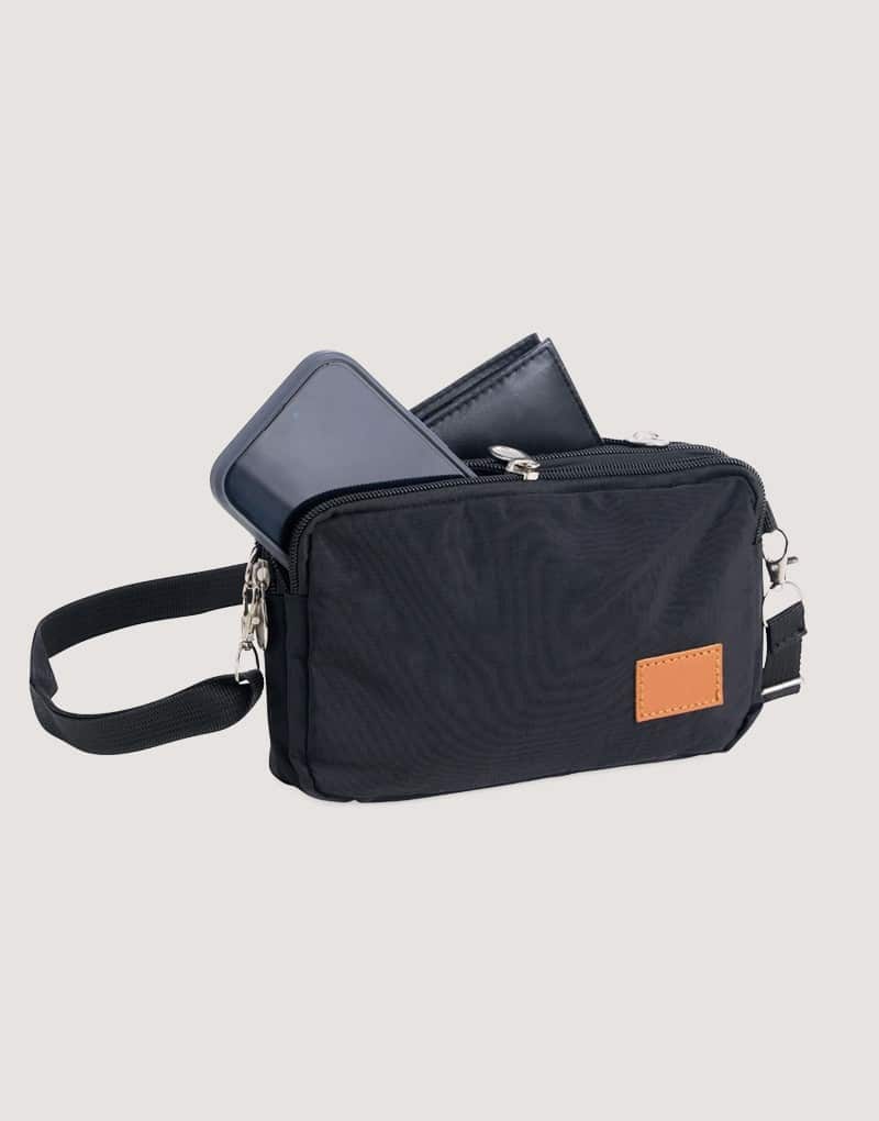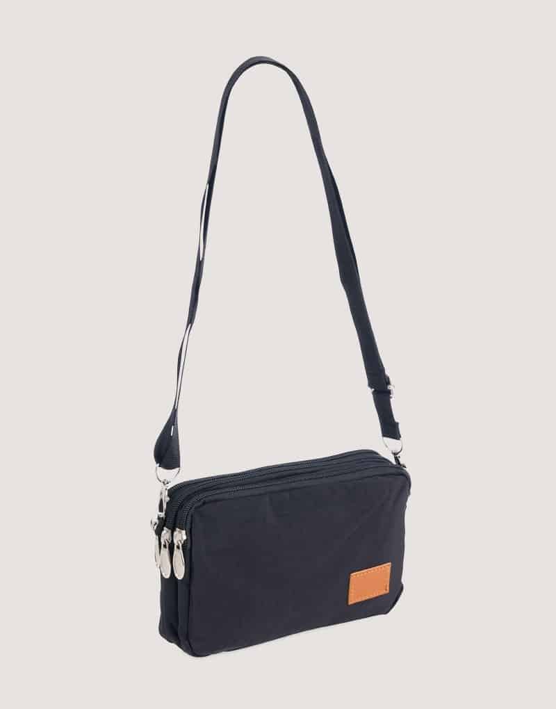 Bolsa de ombro em nylon resistente à água, com três compartimentos, alça regulável e etiqueta com espaço para personalização em couro sintético. Executando o papel de ser um bolso extra para guardar e encontrar rapidamente os acessórios do dia a dia.
