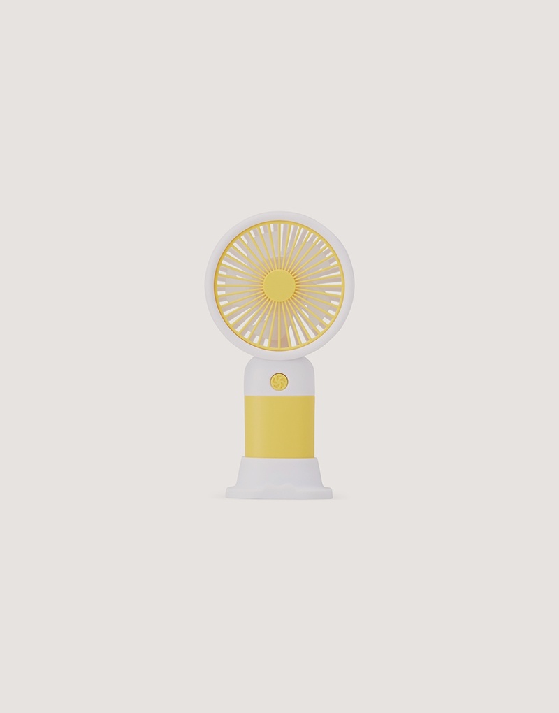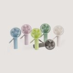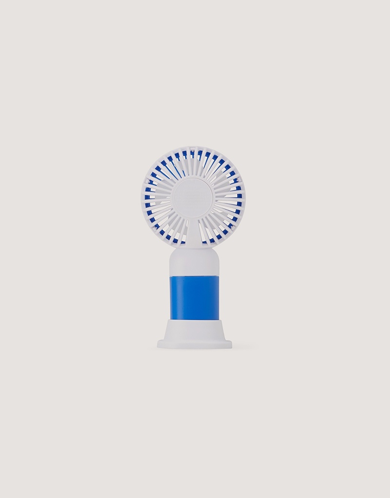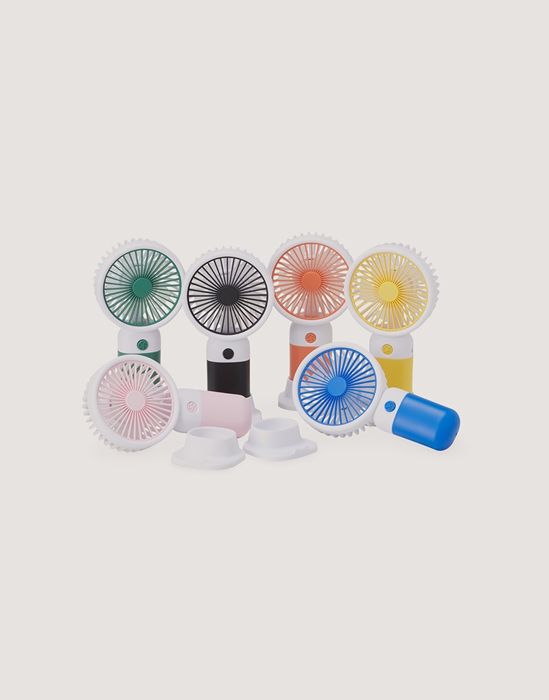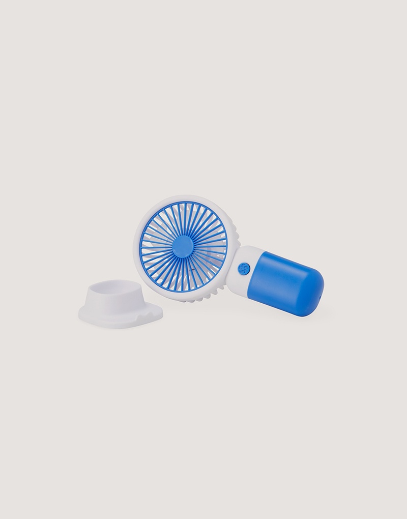 Descrição: Mini ventilador plástico recarregável com base removível e botão de acionamento. Acompanha cabo usb.