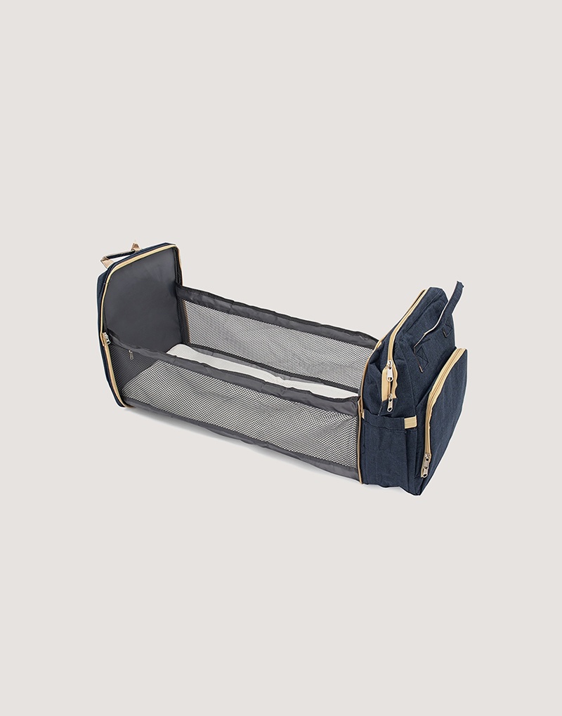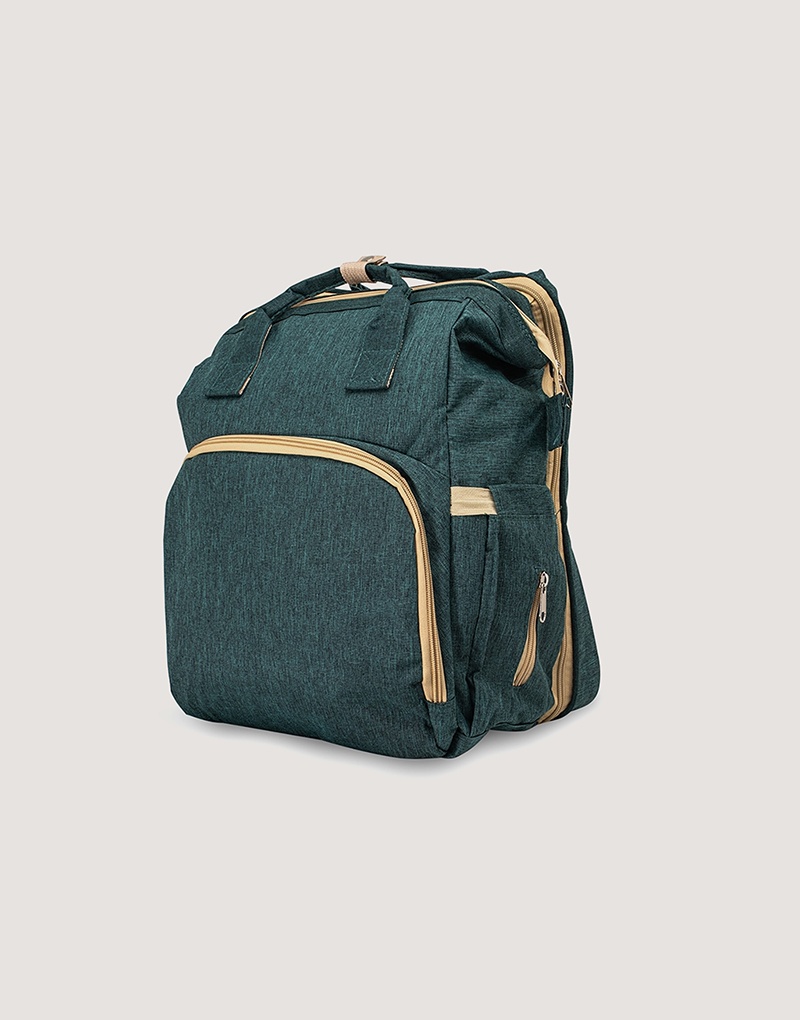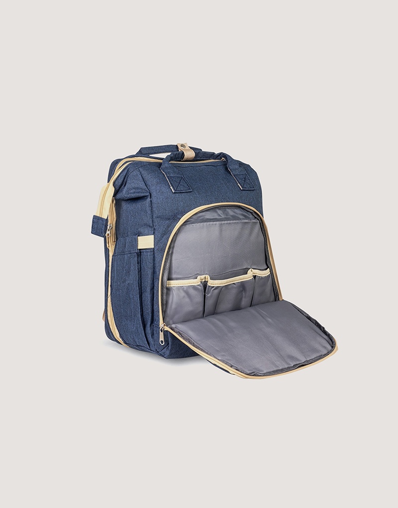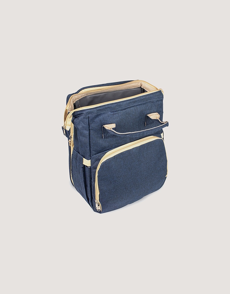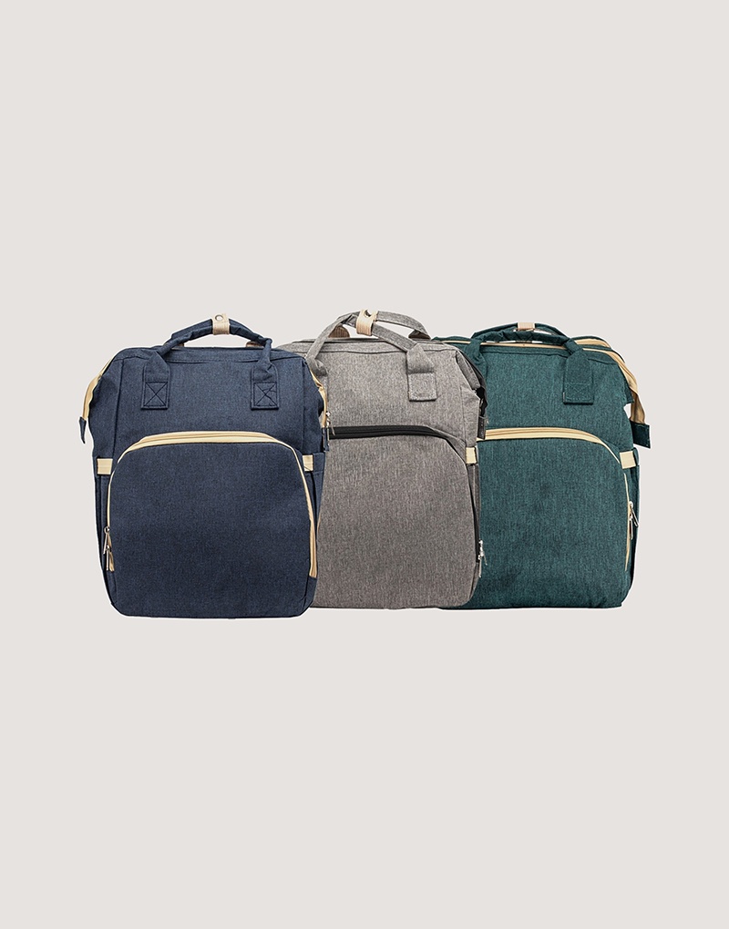 Fabricada em nylon resistente à água, possui quatro compartimentos inteligentes: bolso frontal com três divisórias térmicas, bolsos laterais com elástico (incluindo porta-lenços), compartimento principal espaçoso com quatro bolsos internos e zíper traseiro que transforma a mochila em berço com mini colchão. Versátil, acompanha duas alças de mão e duas extras para pendurar onde precisar.
