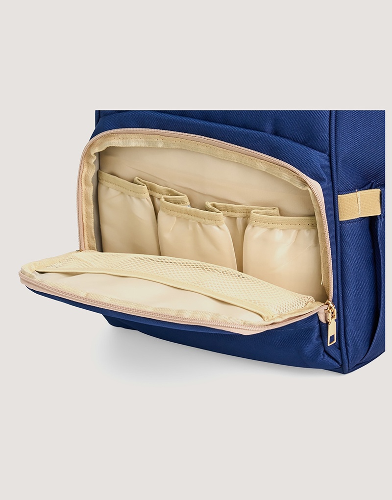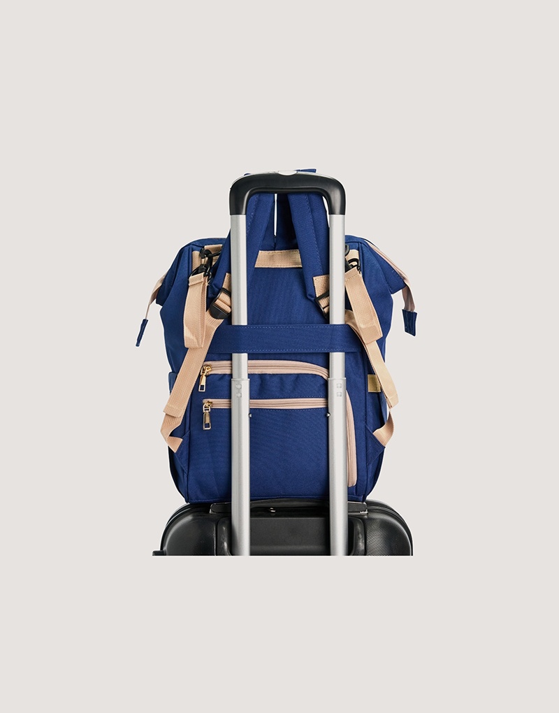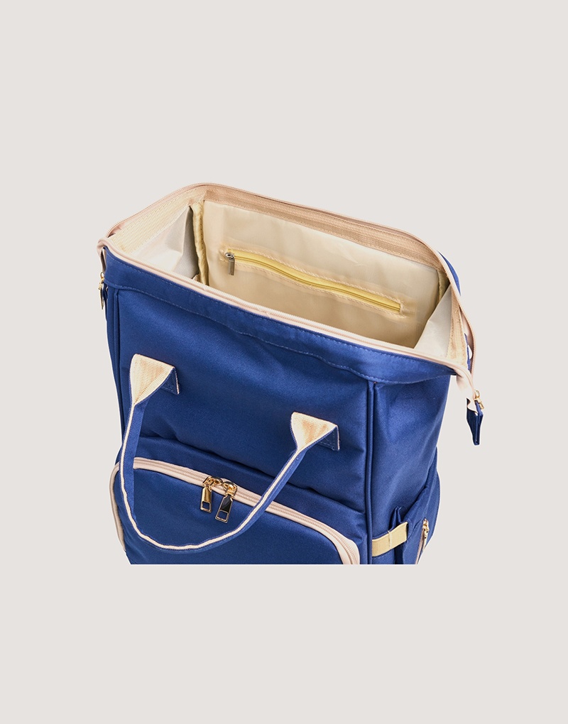 Confeccionada em tecido oxford resistente à água, possui três compartimentos bem distribuídos. O principal tem armação metálica para fácil abertura, seis bolsos internos (um plástico para itens molhados) e acesso traseiro. O compartimento frontal traz três bolsos térmicos e bolso em tela; o terceiro compartimento fica nas costas. Conta ainda com bolsos laterais, alças de mão com suporte, alça para engate em malas e alças ajustáveis para as costas.