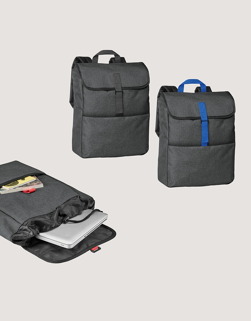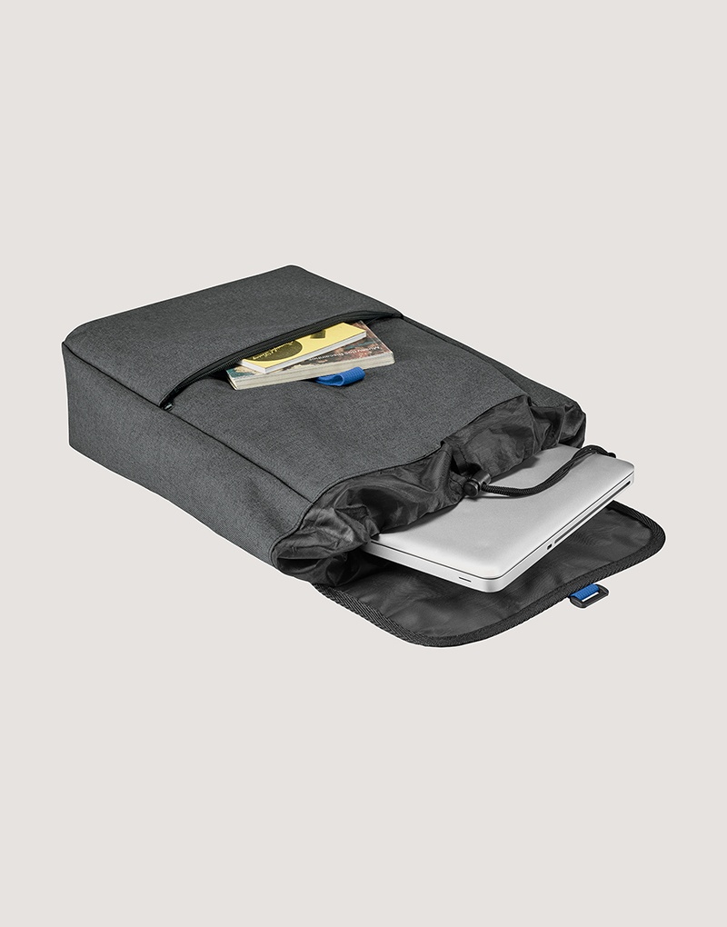 Mochila para notebook em 600D de alta densidade. Compartimento principal com divisória almofadada para notebook até 15.6″. Bolso frontal com zíper. Parte posterior e alças almofadadas. Capacidade até 10 L.