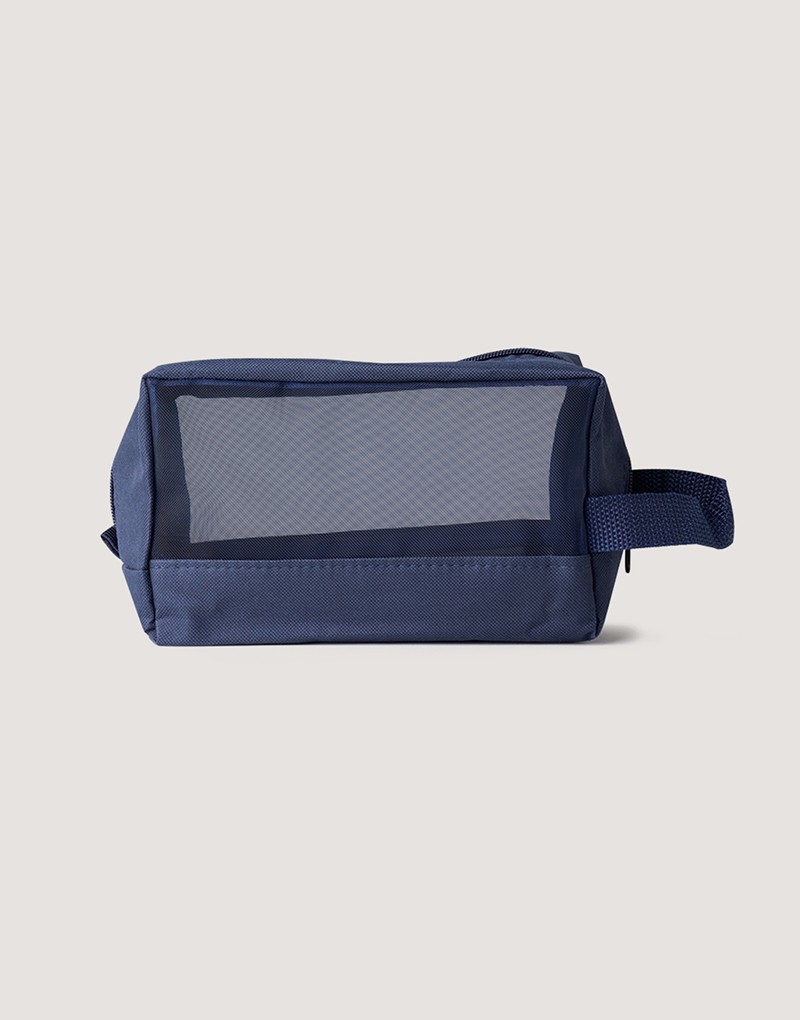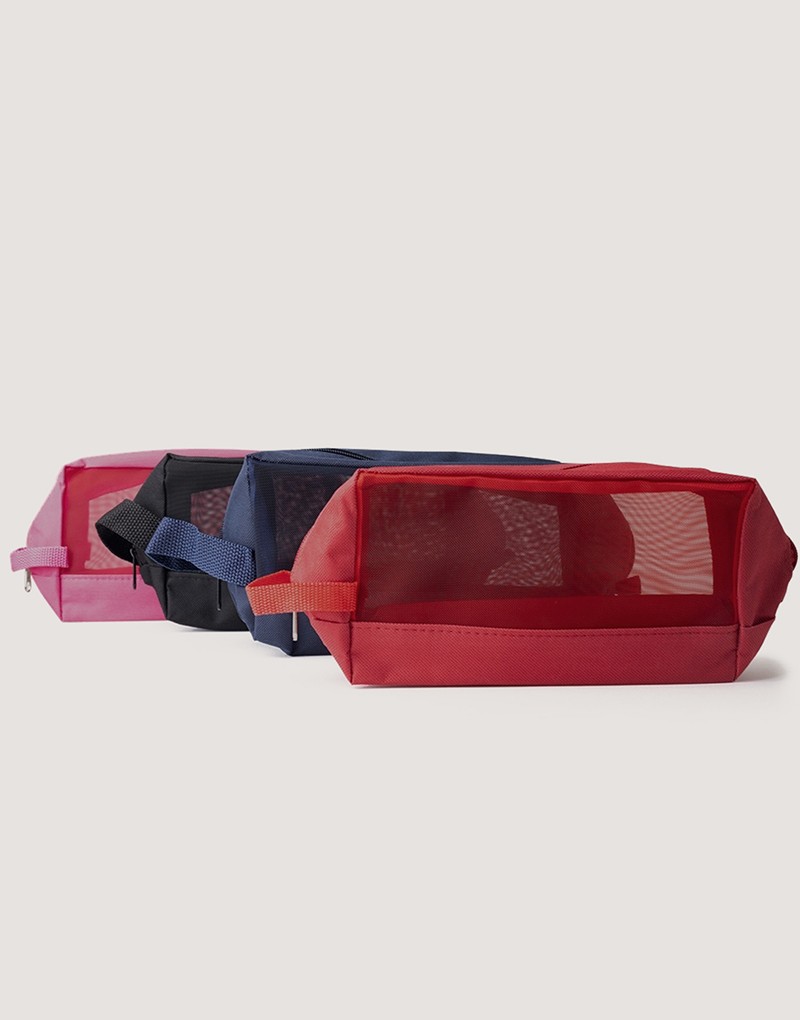 Descrição: Nécessaire confeccionada em nylon. Possui frente e verso com visor telado, zíper superior, alça para transporte e alça pequena para acesso de chaveiro ou gancho.