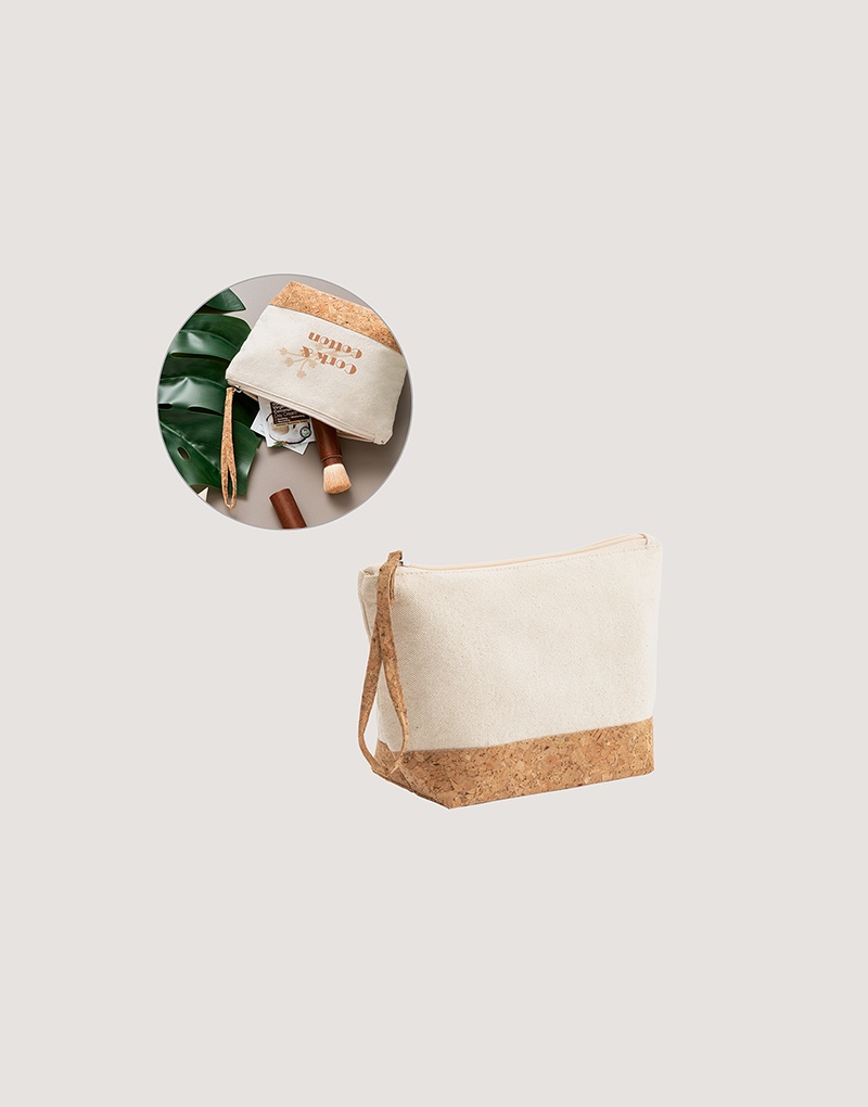 Bolsa de cosméticos 100% algodão (280 g/m²) com detalhes em cortiça no fundo da bolsa e puxador do fecho, que também tem a função de pega para facilitar o transporte. O interior é forrado, sendo de fácil limpeza e rápida secagem, ideal para guardar maquiagem.