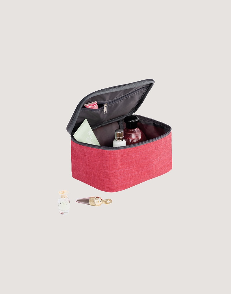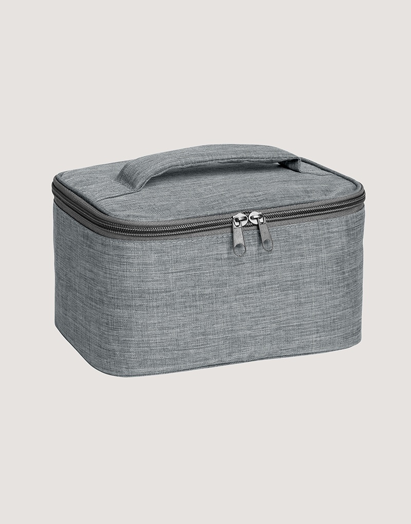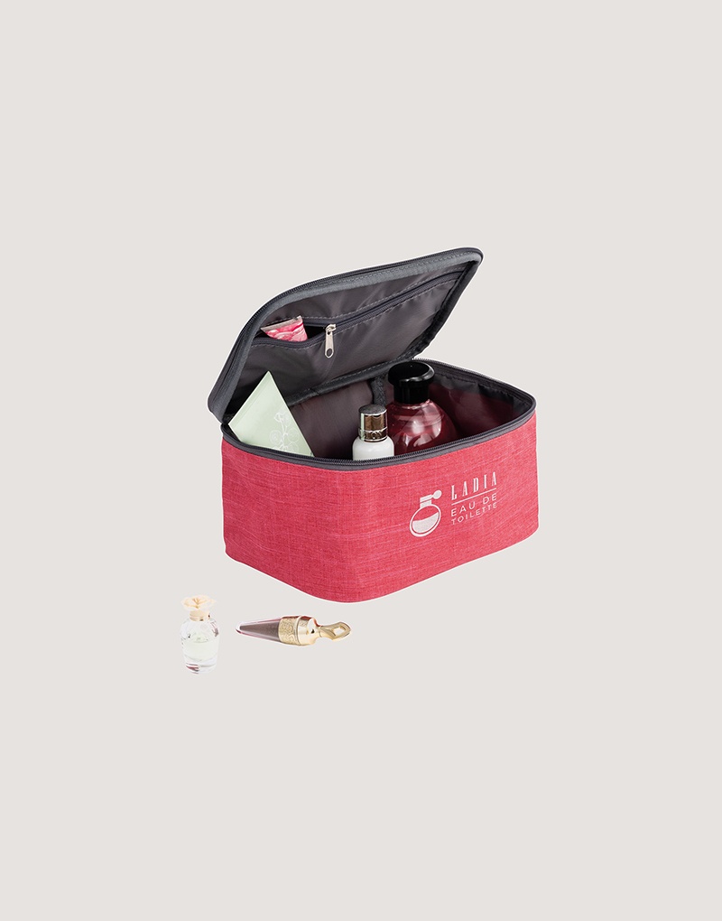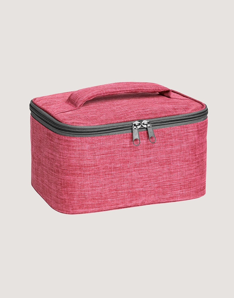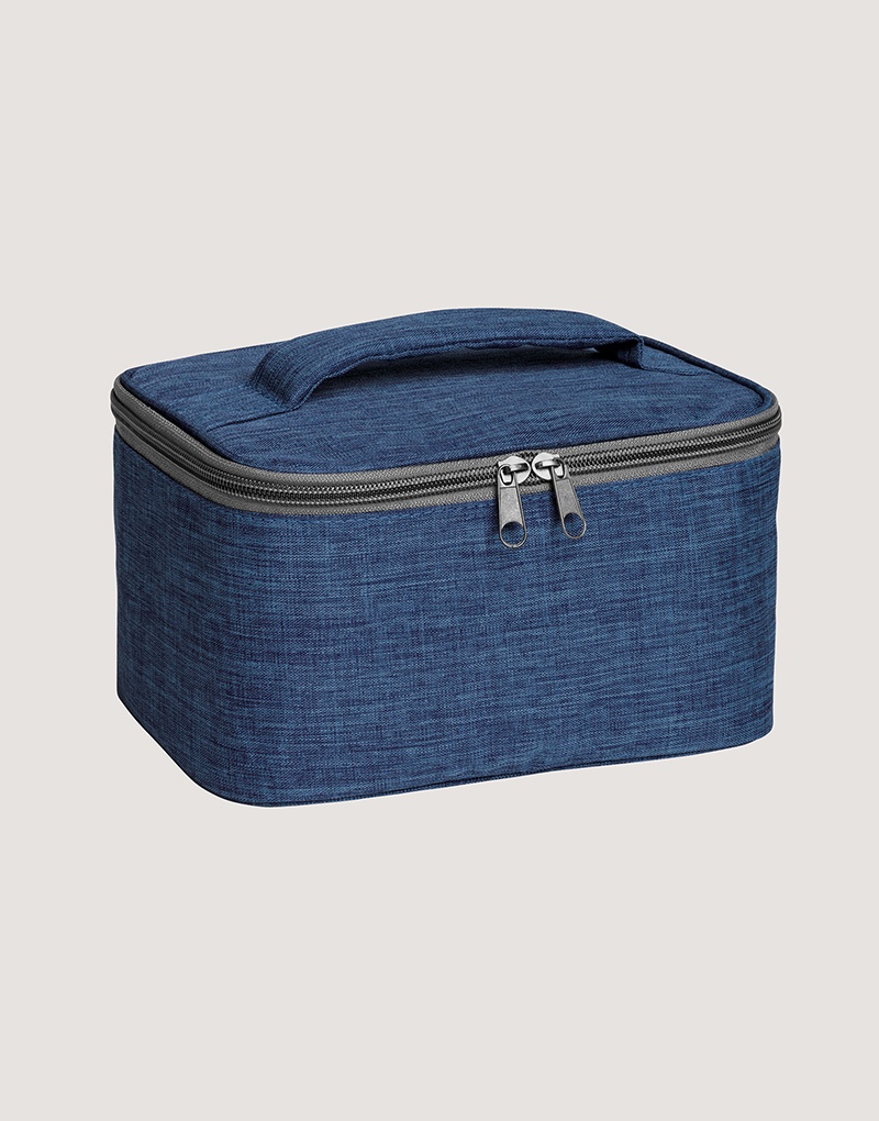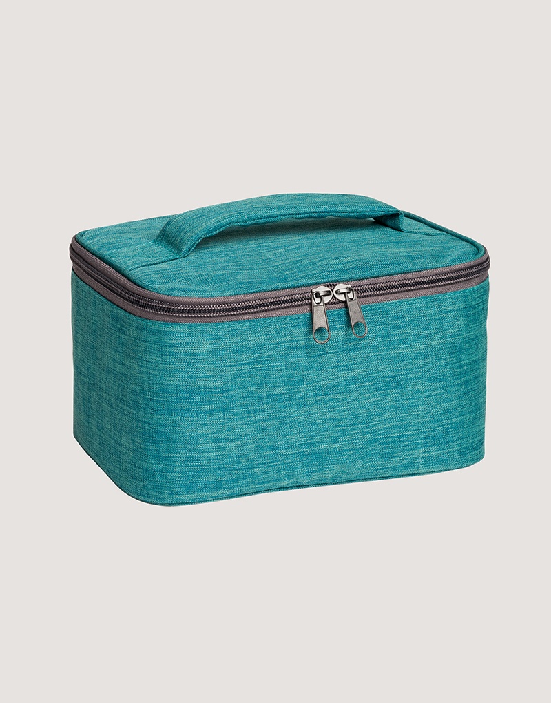 Bolsa de cosméticos em 300D de alta densidade com pega almofadada, interior forrado e bolso interior com zíper.