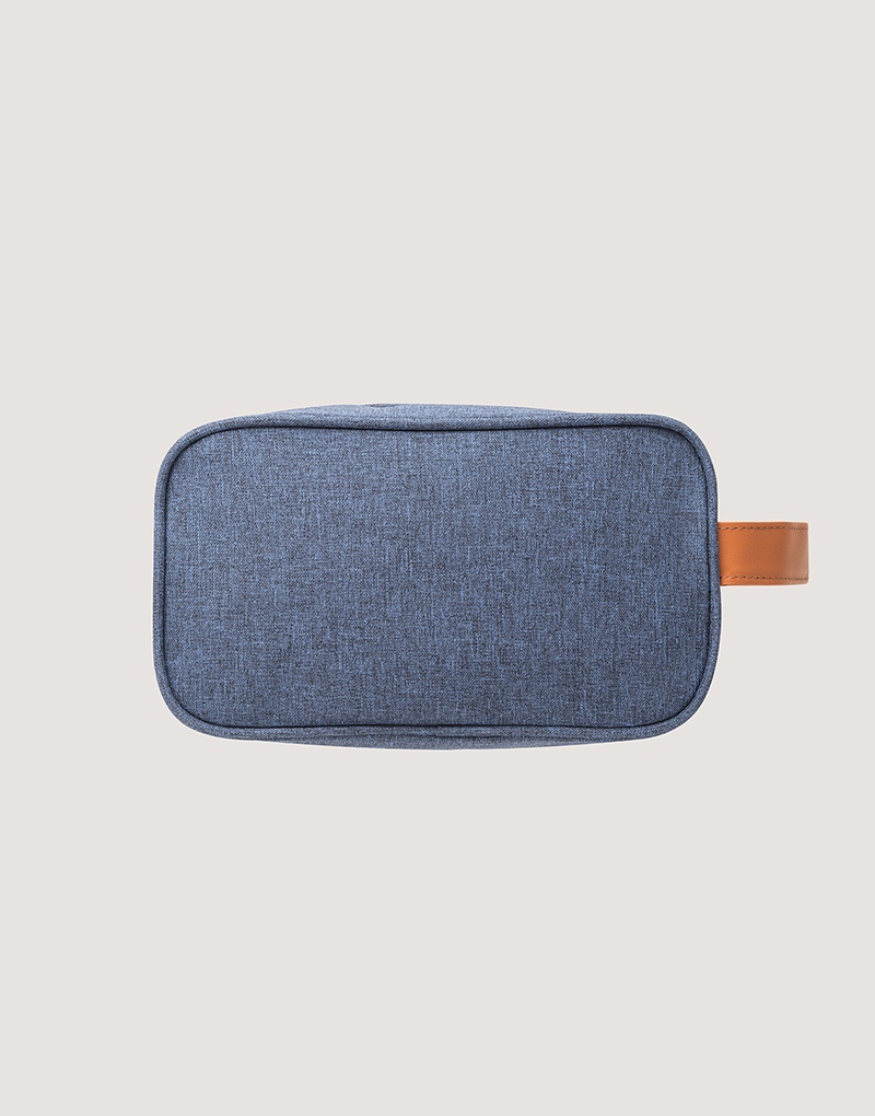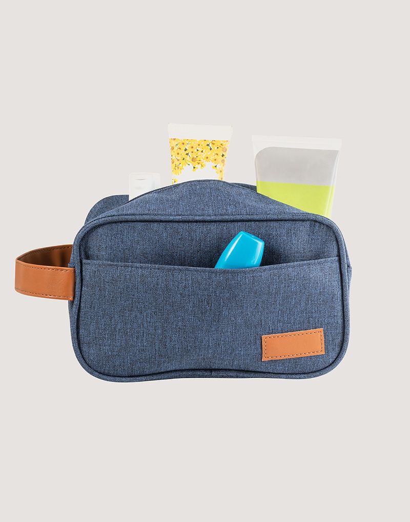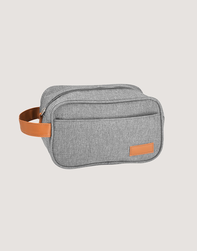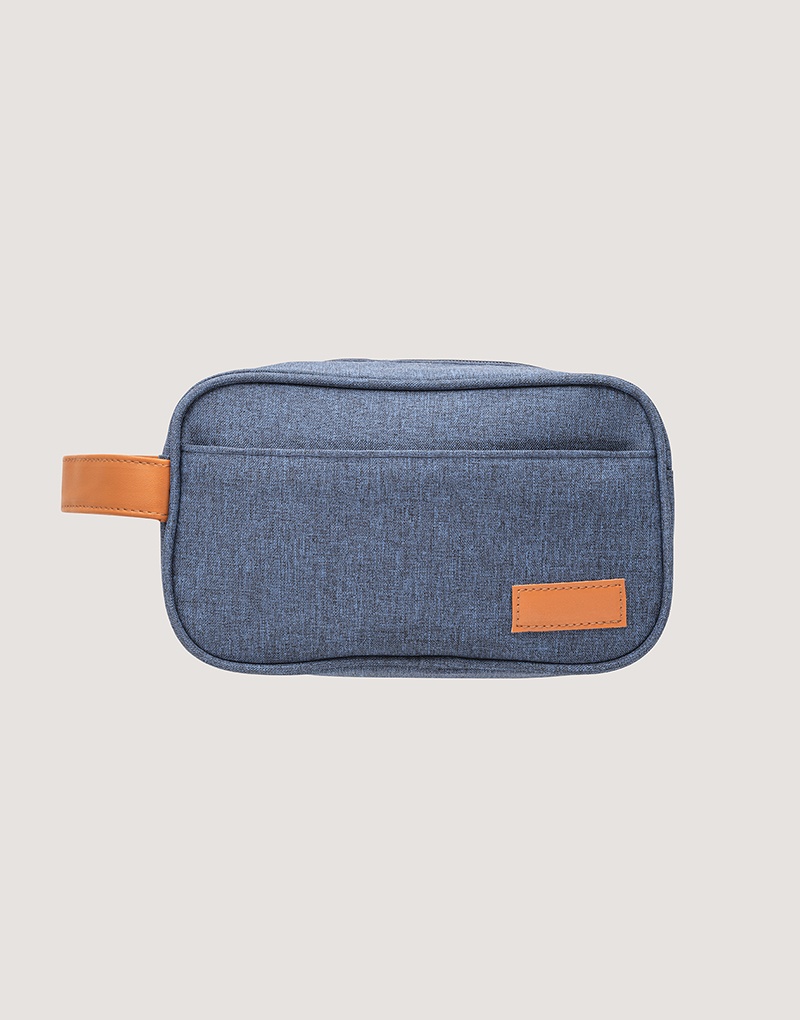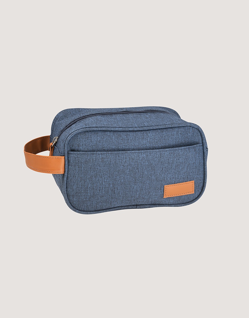 Bolsa de cosméticos em 600D de alta densidade e pega em PU. Contém bolso frontal com zíper e placa em PU.