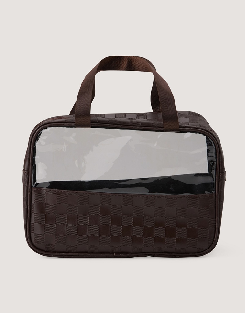 Descrição: Nécessaire de PVC e couro sintético impermeável em xadrez . Possui visor transparente e duas alças laterais de mão em nylon.