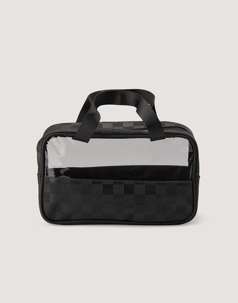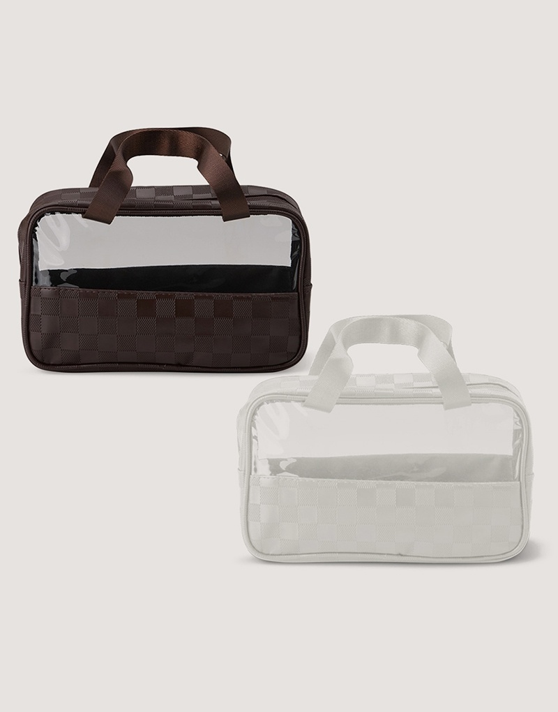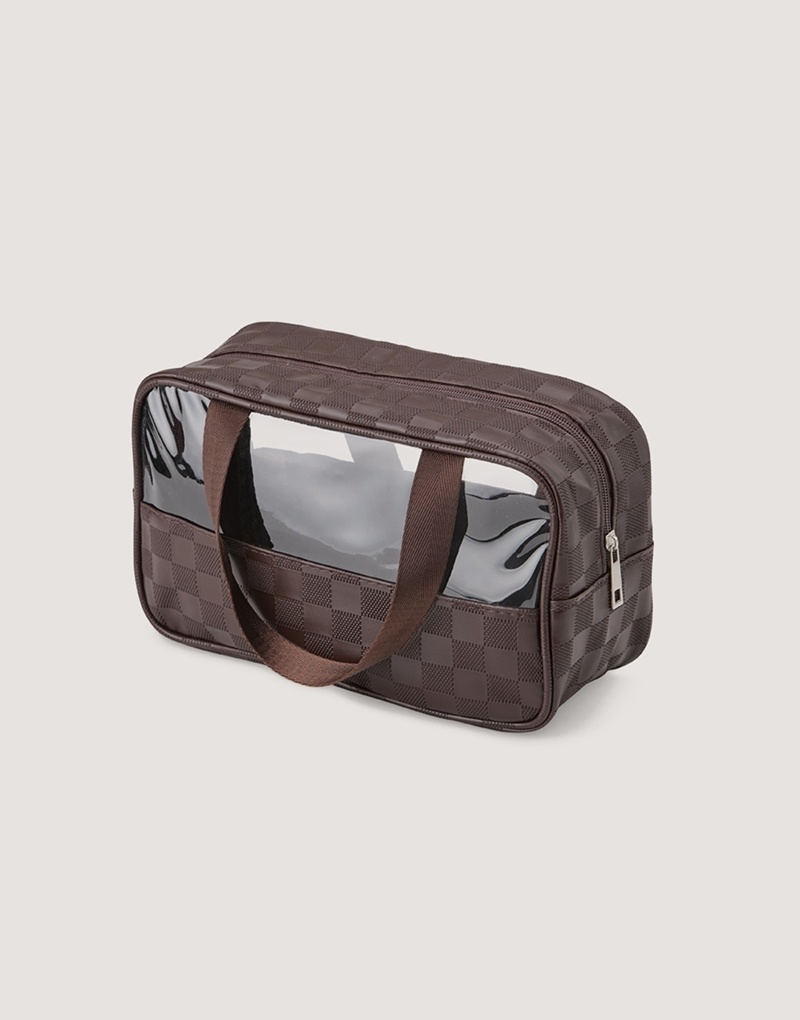 Descrição: Nécessaire de PVC e couro sintético impermeável em xadrez . Possui visor transparente e duas alças laterais de mão em nylon.