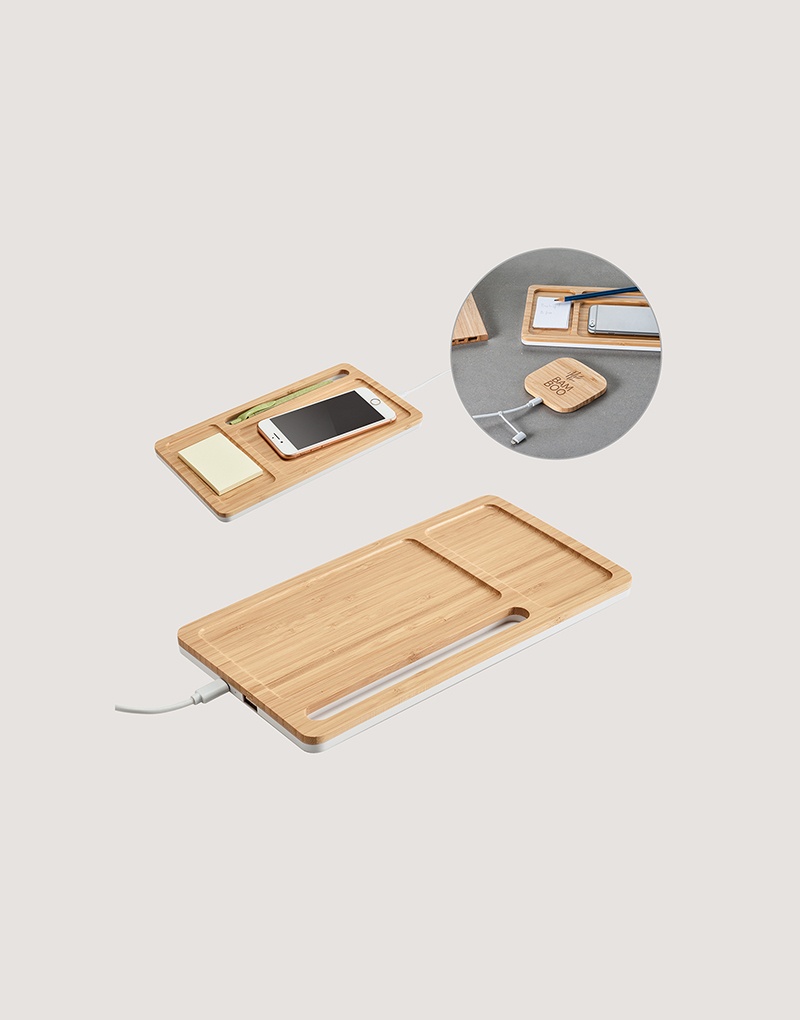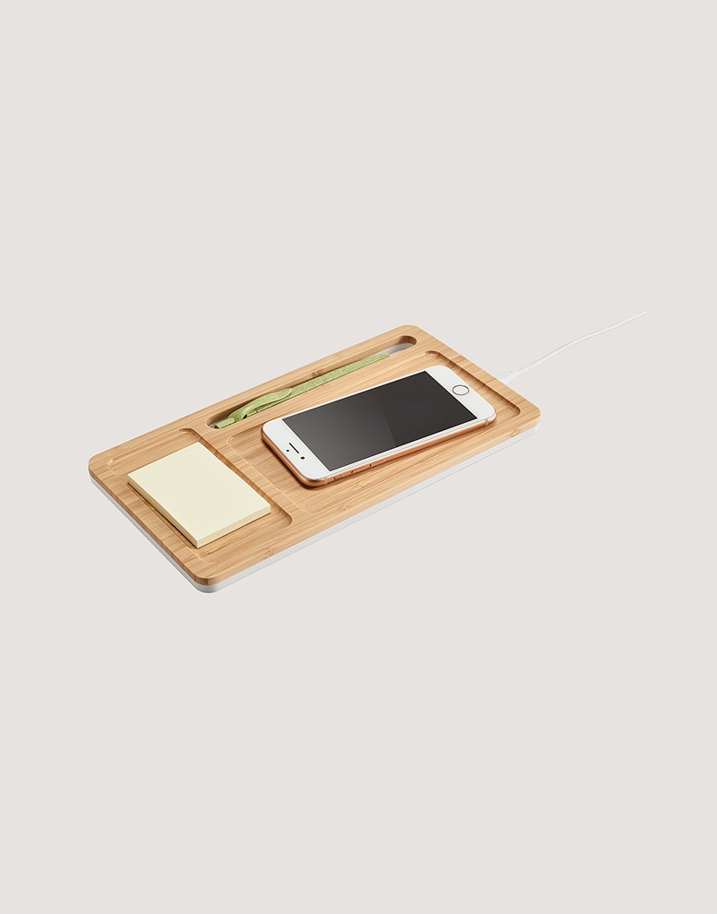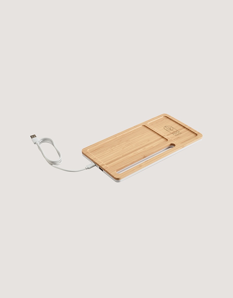 Organizador de mesa em bambu e ABS. Incluso carregador wireless super rápido com potência máxima de 15W, hub USB-A e suporte para celular. Uma porta de entrada USB-C e porta de saída USB-A. Incluso cabo USB-C, de 90 cm, para carregar. Compatível com smartphones com tecnologia de carregamento sem fios. Fornecido em caixa presente. A cor e o resultado da impressão nos materiais naturais pode variar entre produtos.