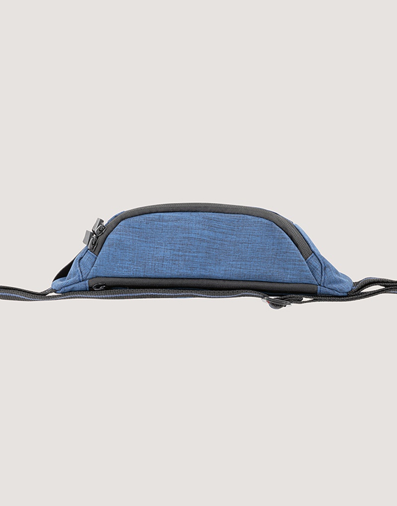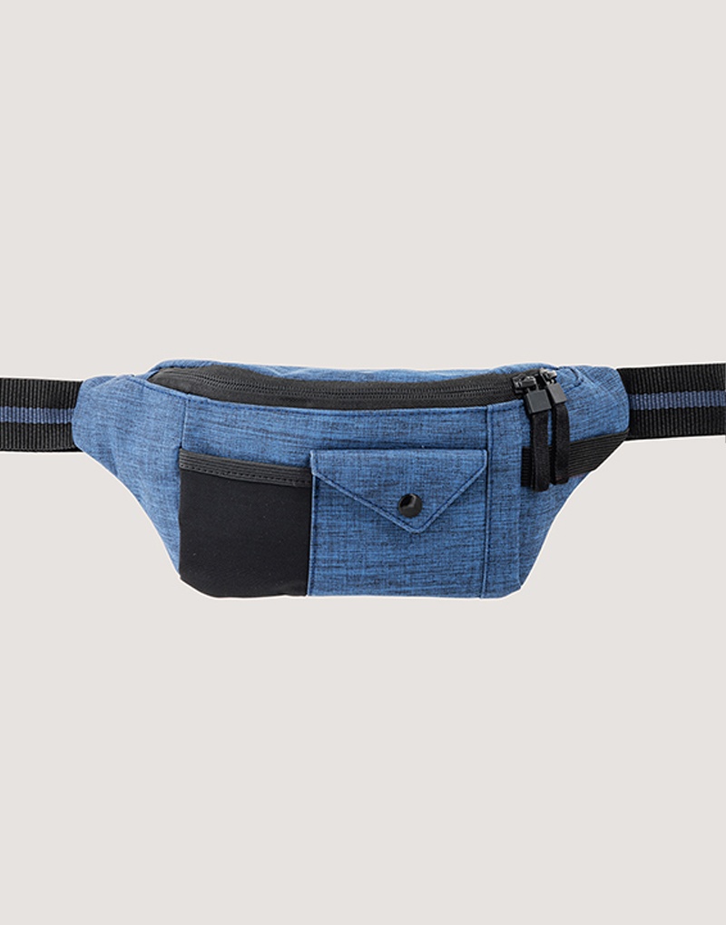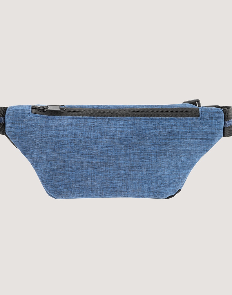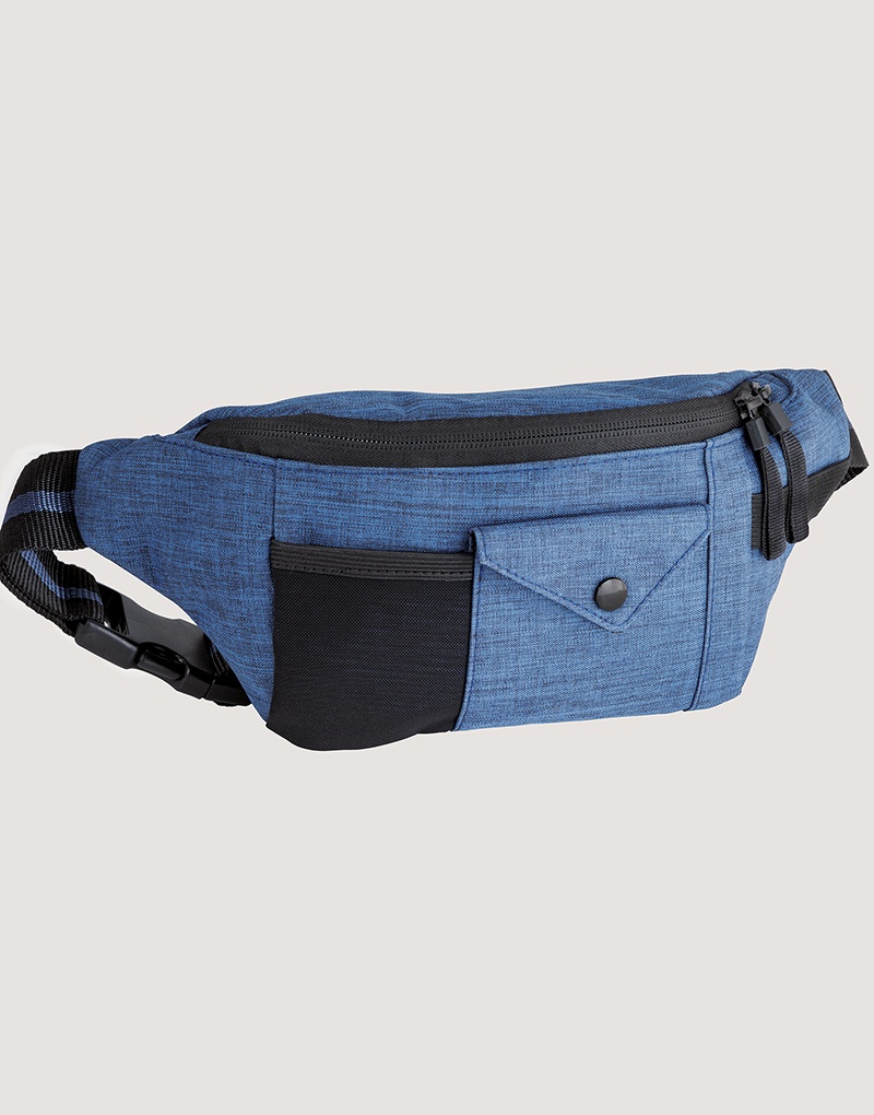 Bolsa de cintura em 300D de alta densidade. Compartimento principal com fecho e bolso interior em rede elástica e bolso na parte posterior de fácil acesso, ideal para guardar os bens com maior segurança. A parte frontal contém um bolso em rede elástica, um bolso com pala, botão para fecho e um elástico na lateral, indicado para pendurar mosquetões ou óculos de sol. A alça é ajustável em webbing com fecho.