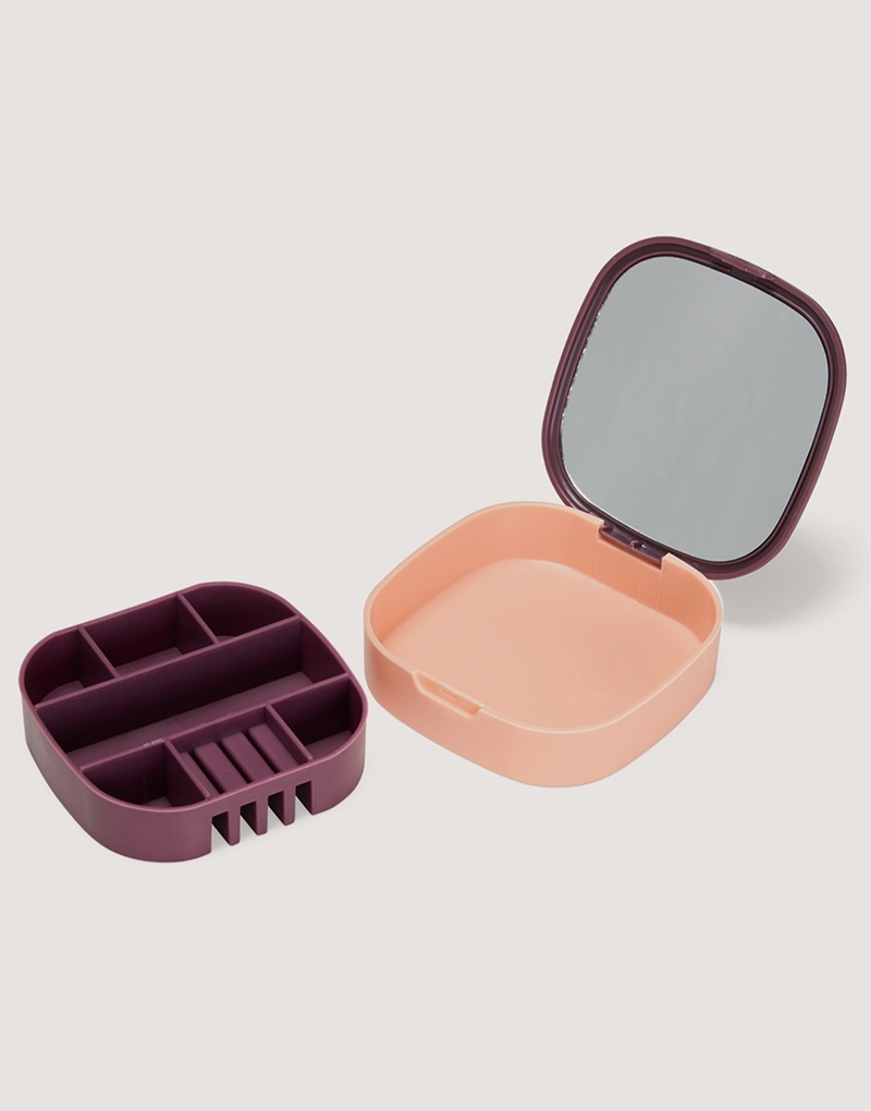 Descrição: Nosso Porta-jóias organiza seus acessórios de forma prática e compacta. Produzido em plástico, é a escolha ideal para manter anéis, brincos, batom e pulseiras sempre acessíveis. Com 7 compartimentos estratégicos para guardar tudo, feitos em material macio e emborrachado, removíveis para facilitar a limpeza, ele também conta com um espelho na tampa, facilitando na hora de montar looks com as jóias. Perfeito para quem valoriza organização, autocuidado e praticidade no dia a dia.