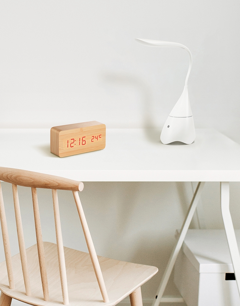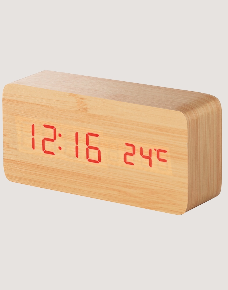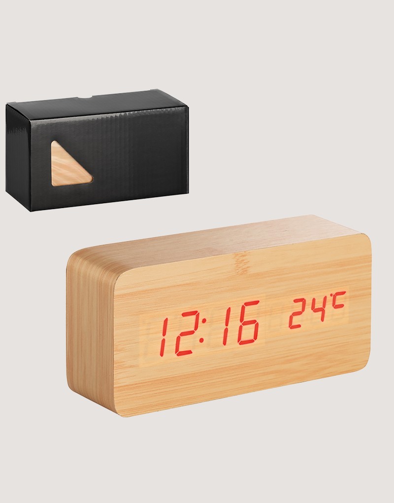 Relógio em MDF com calendário, alarme e termômetro. Incluso 4 pilhas AAA, 1 pilha CR2032 e cabo USB. Fornecido em caixa presente.