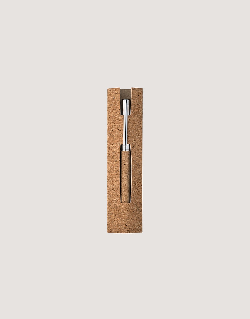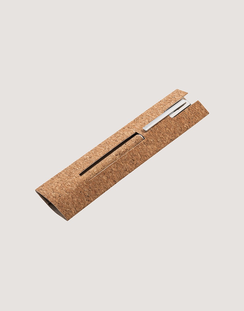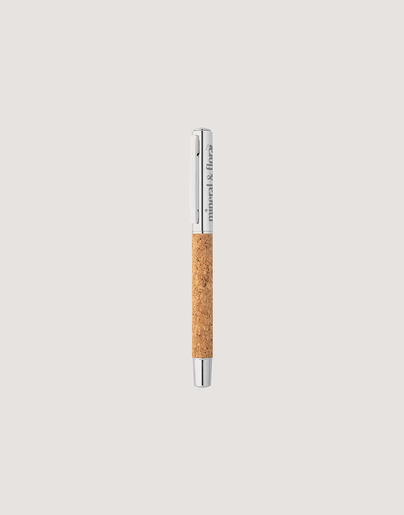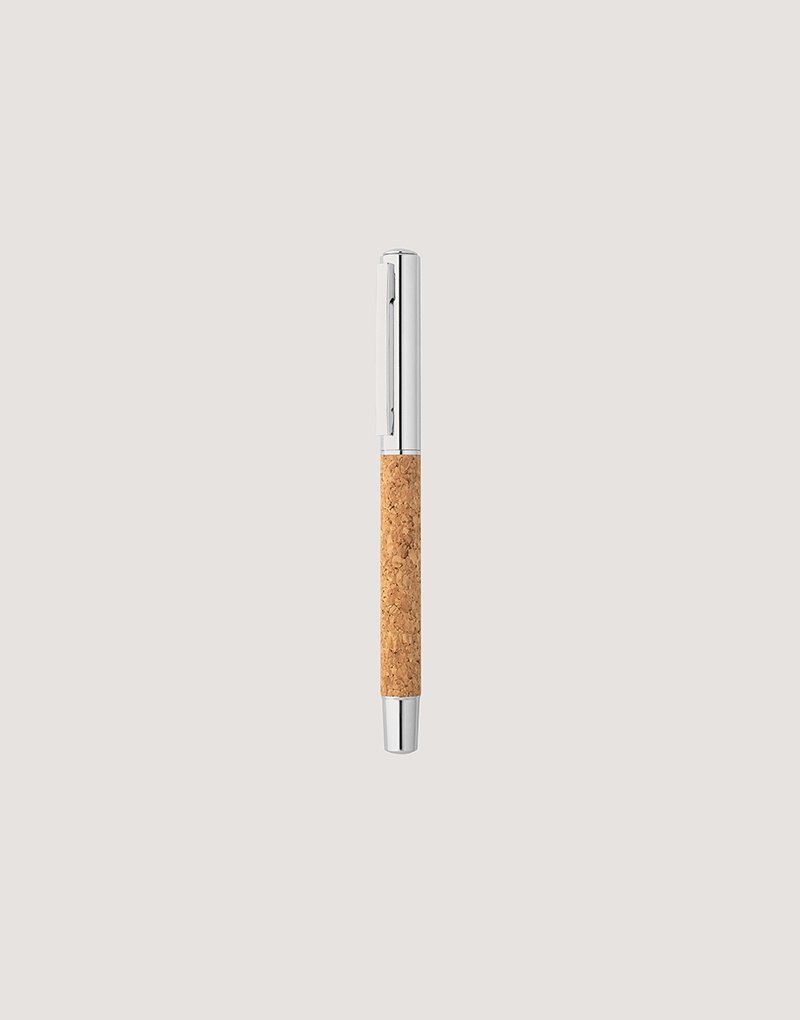Roller com corpo em aço inox 90% reciclado e cortiça com clipe. Escrita em azul. Fornecida numa bolsa de oferta em cortiça. A cor e o resultado da impressão nos materiais naturais pode variar entre produtos.