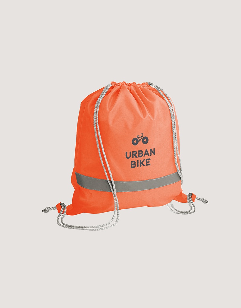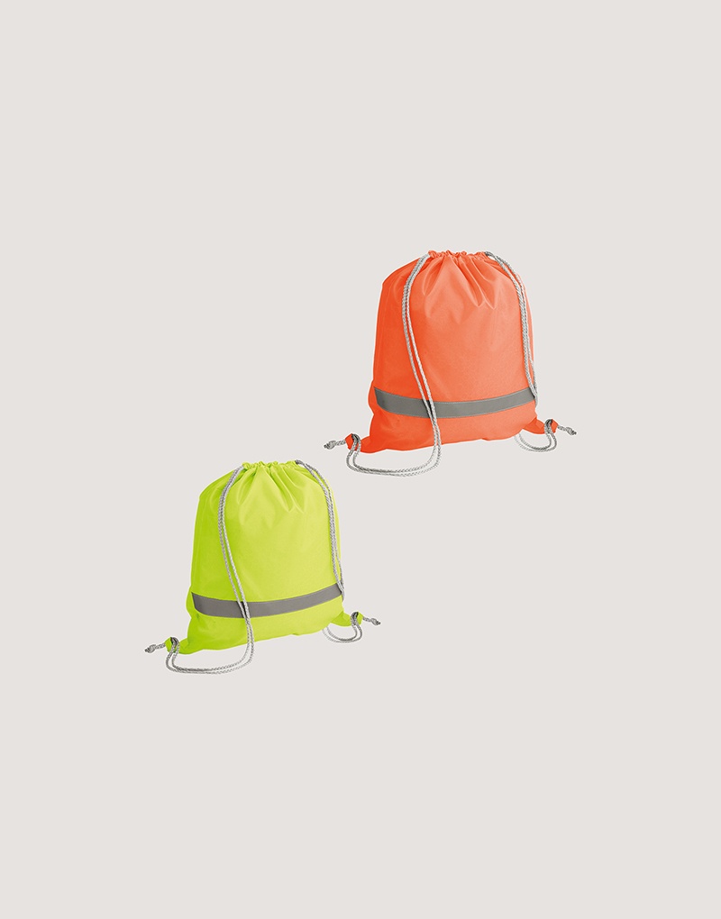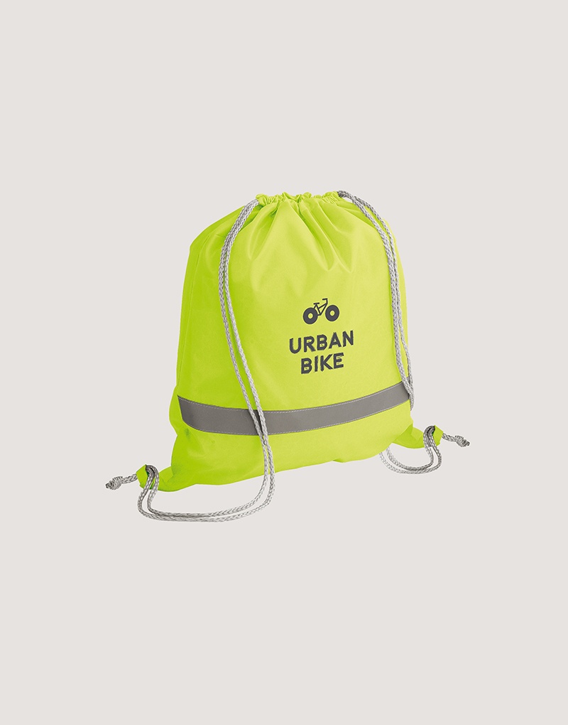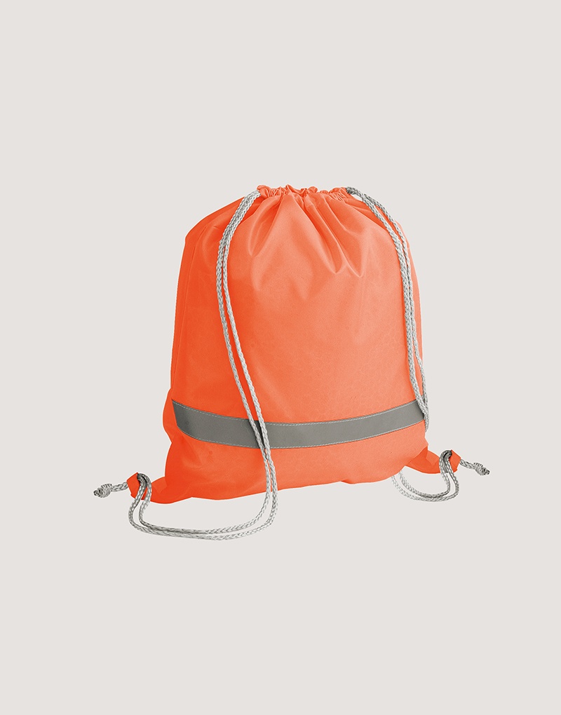 Sacola tipo mochila em 210D, com elementos refletores e alças. Produto promocional.