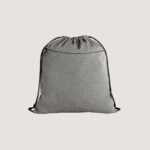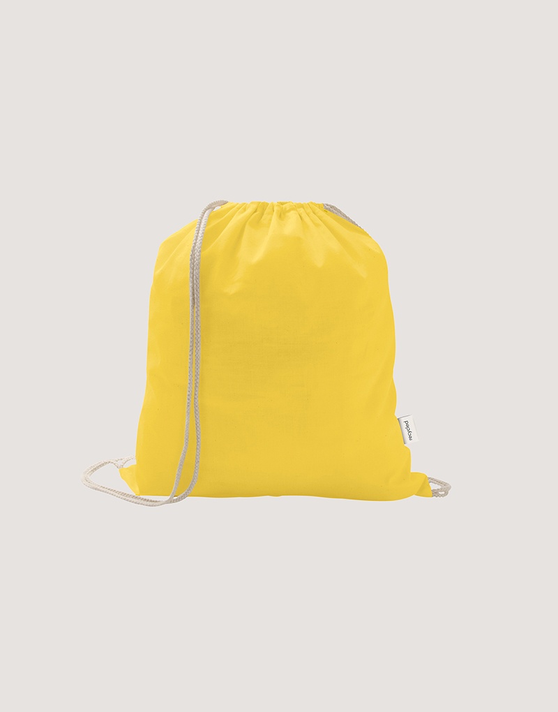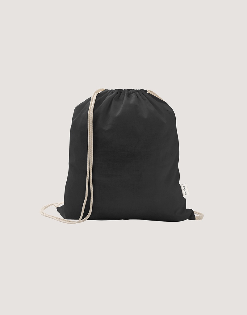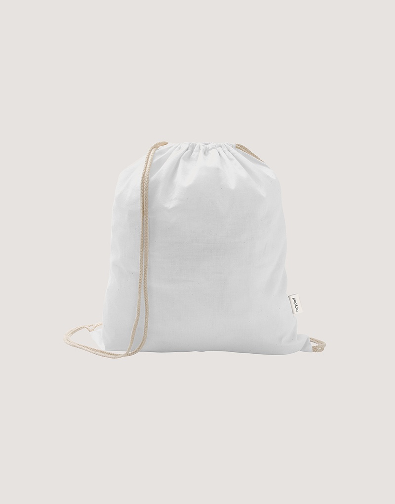 Sacola tipo mochila em 70% algodão reciclado e 30% poliéster reciclado (150 g/m²), com alças de algodão. O tecido é sem tingimento, é utilizado na sua cor original, sem produtos químicos de tingimento ou branqueamento, contribuindo para um menor impacto ambiental.
