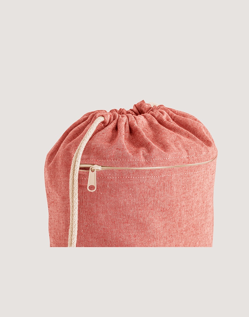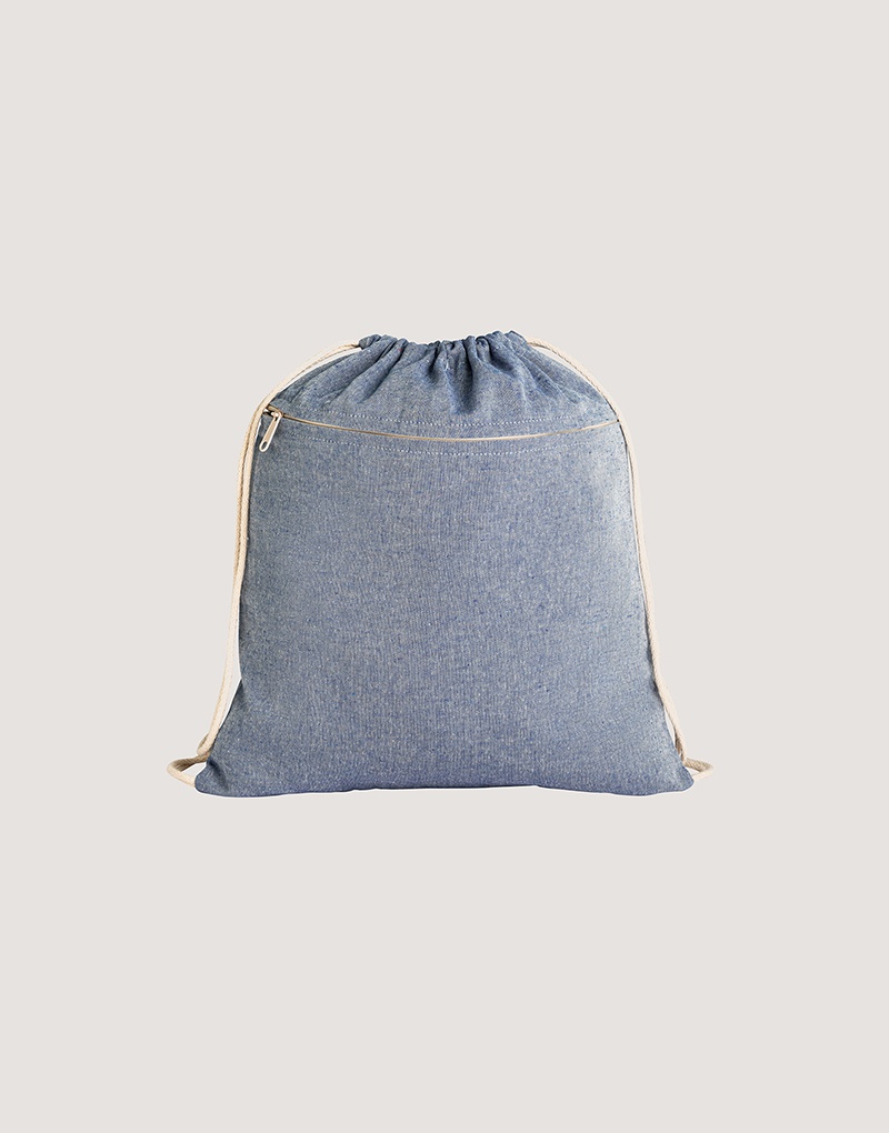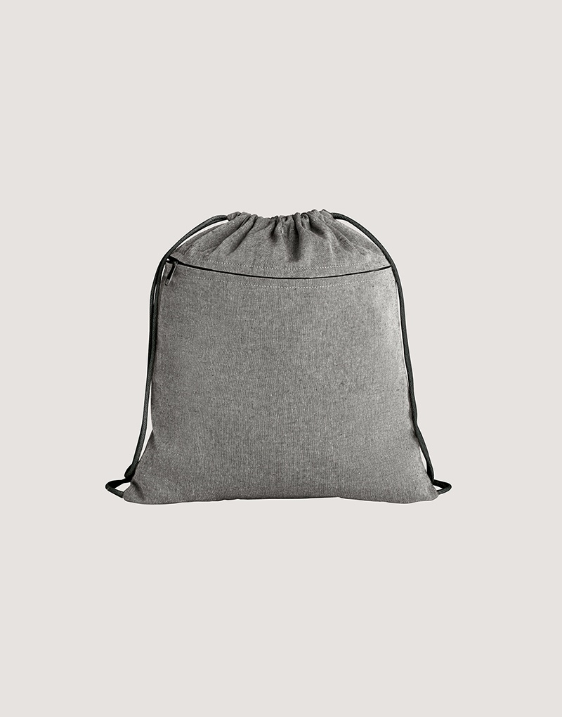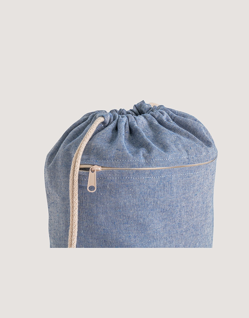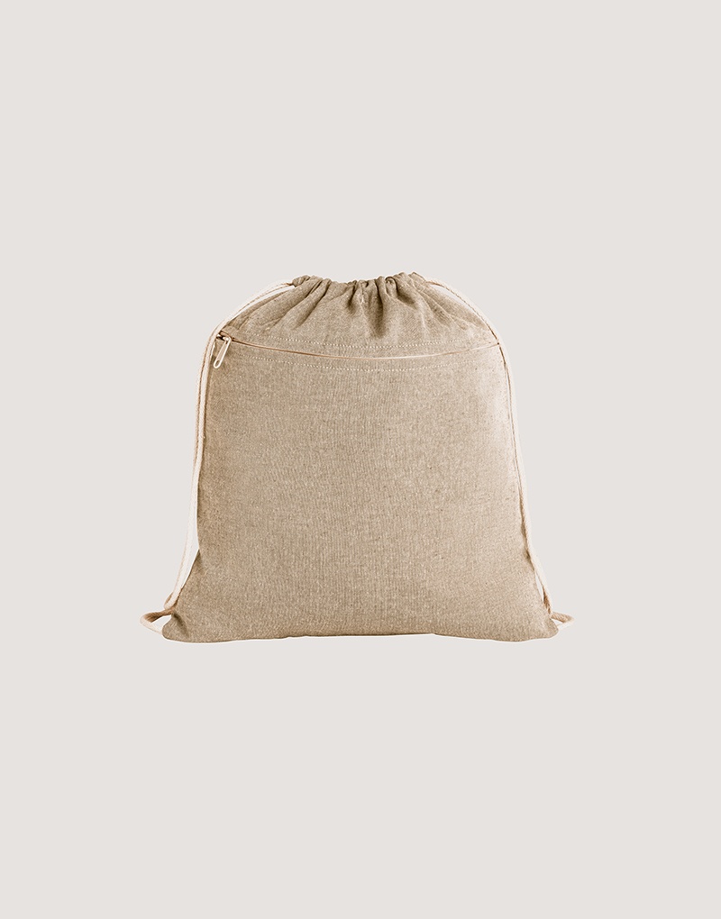 Sacola tipo mochila em 70% algodão reciclado e 30% poliéster reciclado (140 g/m²), com bolso frontal, fecho discreto e alças em algodão. O tecido é sem tingimento, é utilizado na sua cor original, sem produtos químicos de tingimento ou branqueamento, contribuindo para um menor impacto ambiental.