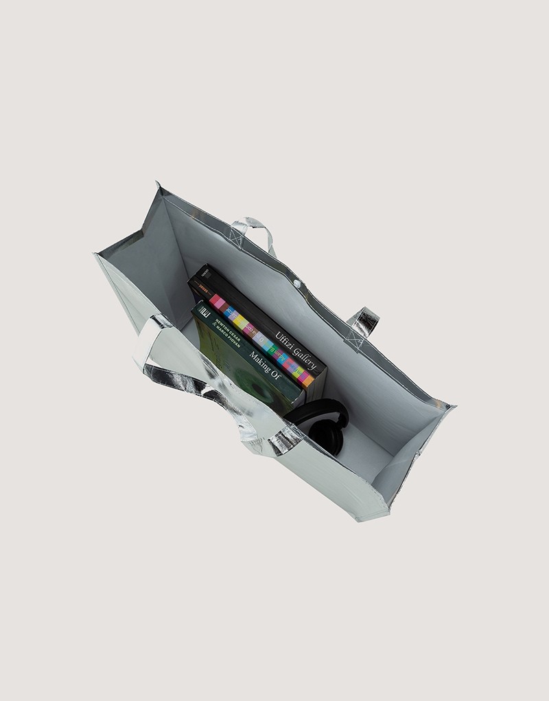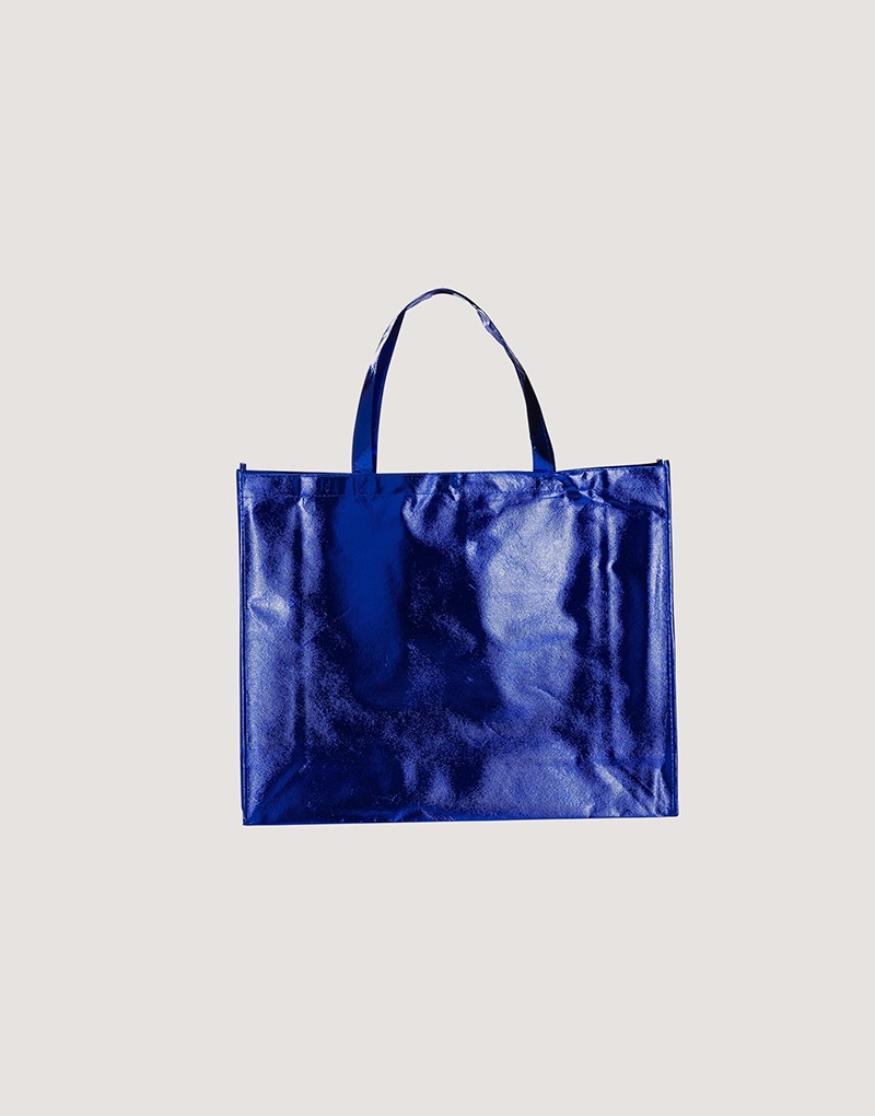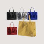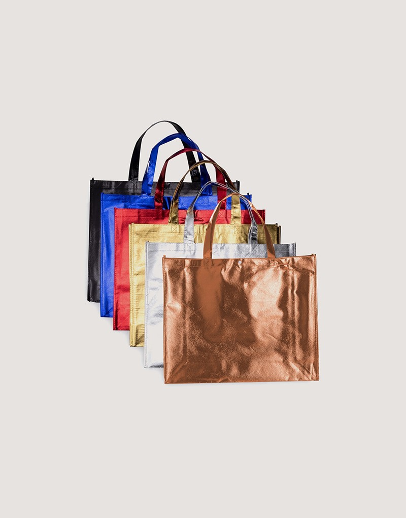 Descrição: Sacola TNT metalizada 120g/m² com botão. Confeccionado em TNT com revestimento laminado, parte superior possui botão plástico para fecho.