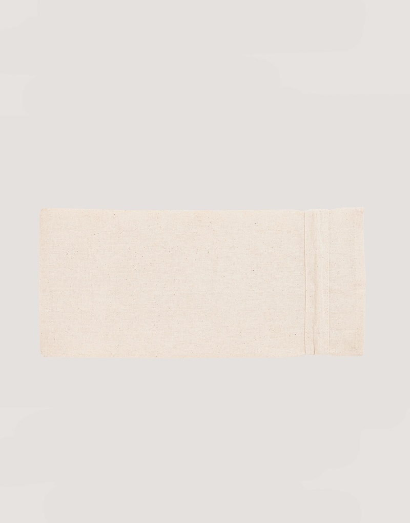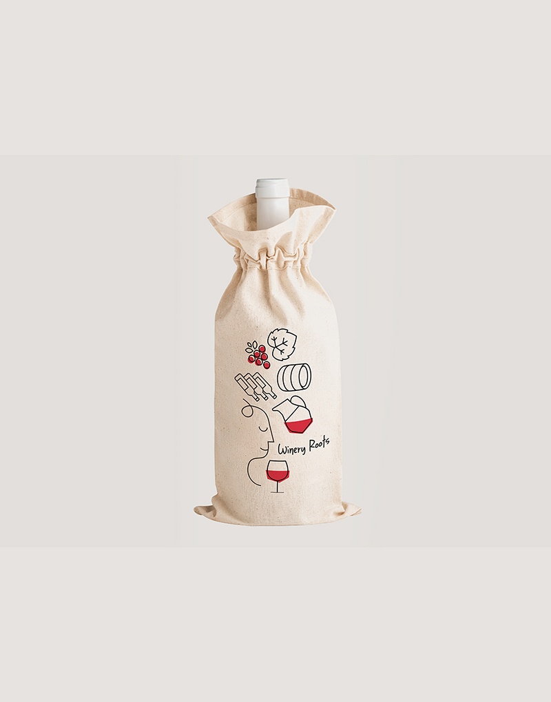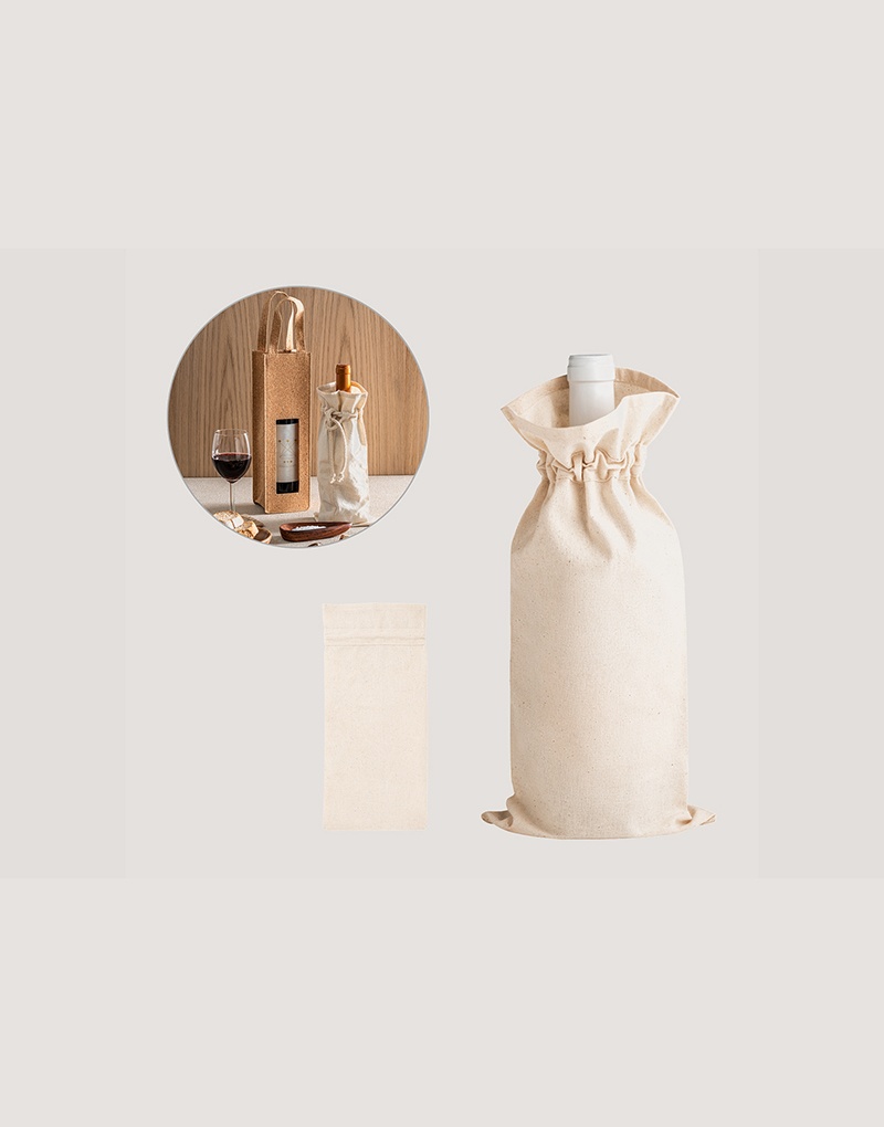Sacola para garrafa em 100% algodão (180 g/m²) com cordão para fechar, também em algodão.