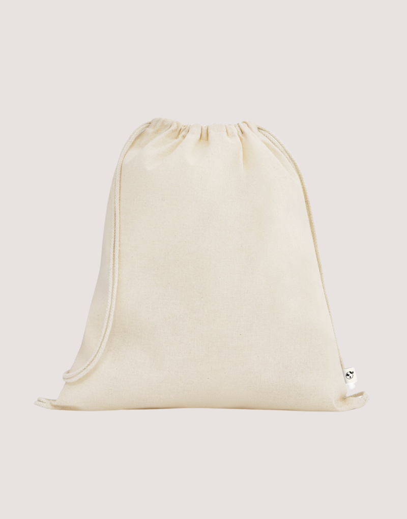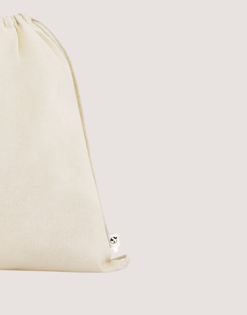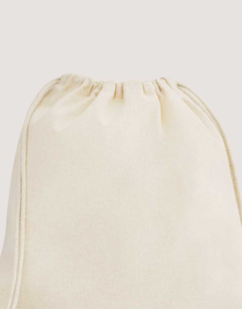 Sacola tipo mochila 100% algodão orgânico (140 g/m²), com alças em algodão para fechar.