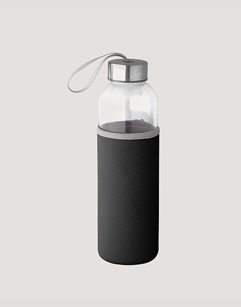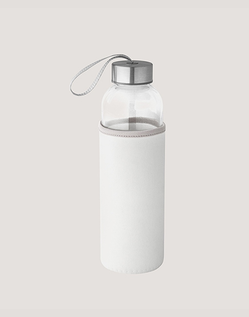 Squeeze em vidro e tampa em aço inox com alça para fácil transporte. Capacidade até 520 mL. Fornecido com luva em soft shell dando proteção extra à sua squeeze. Caixa branca 94651 vendida opcionalmente. Certificação EU Food Grade.