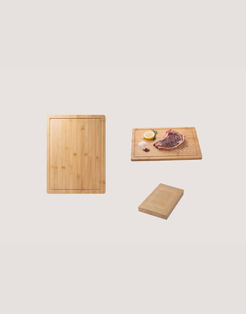 Tábua de corte em bambu. Fornecido com caixa presente de papel kraft reciclado. Certificação EU Food Grade. A cor e o resultado da impressão nos materiais naturais pode variar entre produtos.