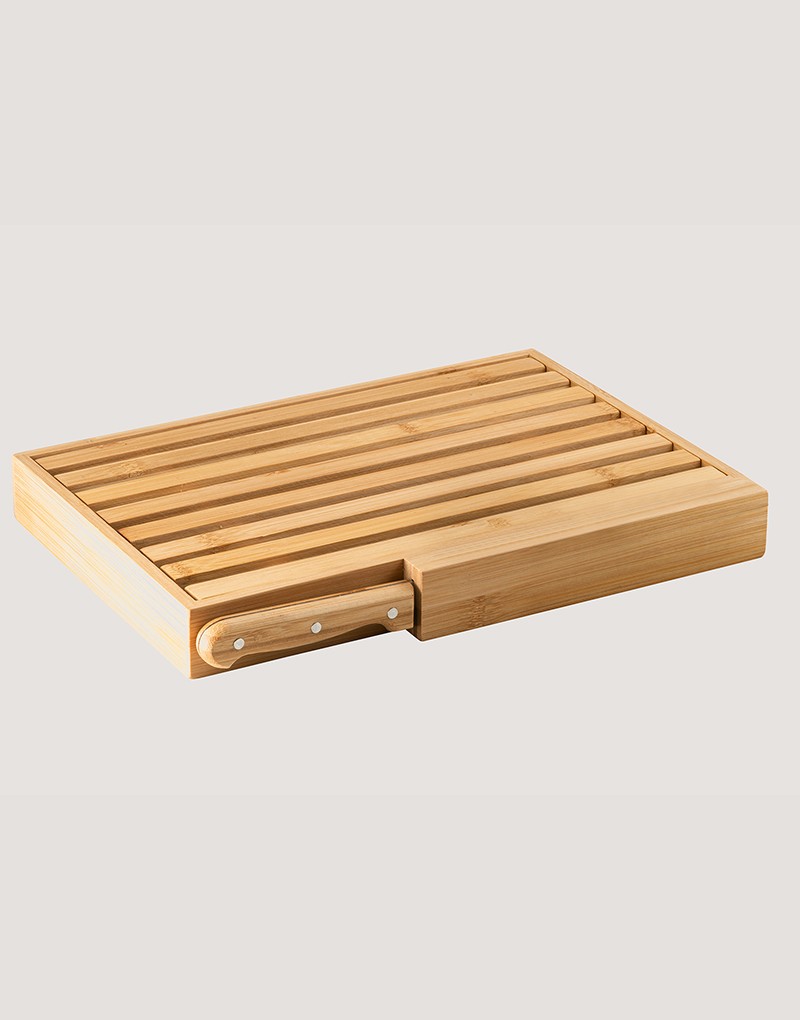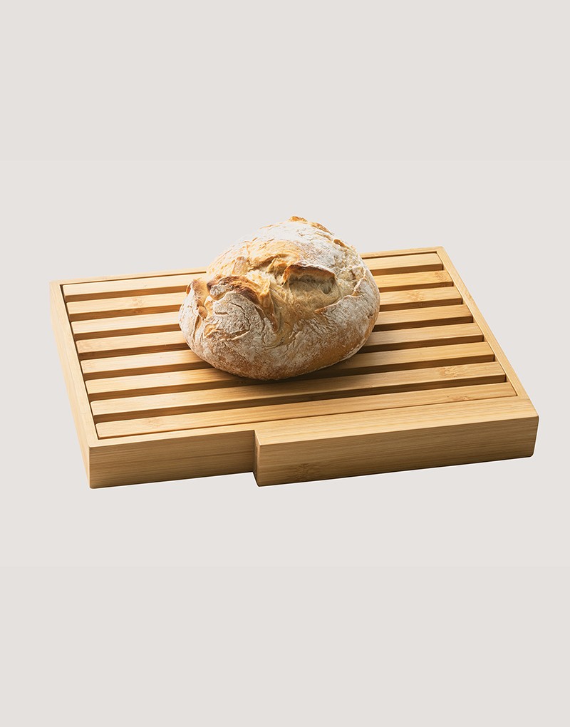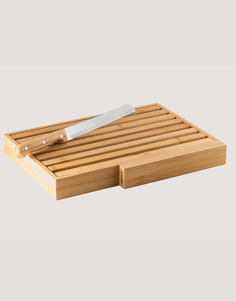 Tábua para pão em bambu com faca em aço inox. Grelha removível para fácil remoção de migalhas. Fornecido em caixa presente em papel kraft reciclado. Certificação EU Food Grade. A cor e o resultado da impressão nos materiais naturais pode variar entre produtos.