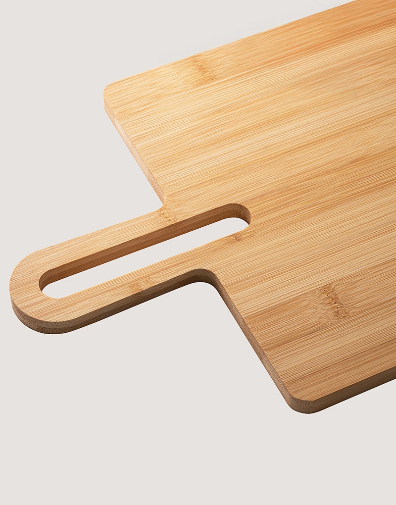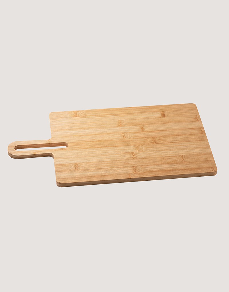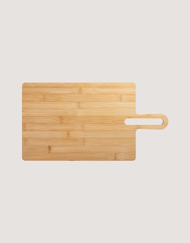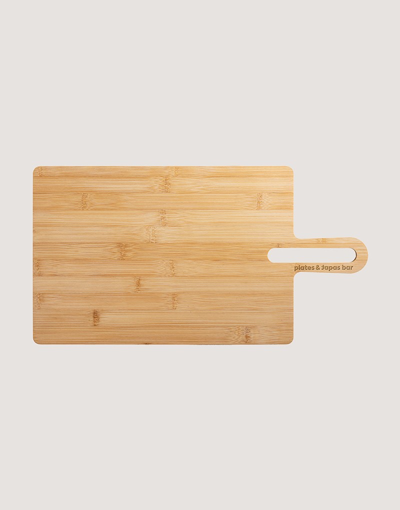 Tábua de servir em bambu com pega, de grande dimensão e de utilização versátil. Fornecido com caixa presente de papel kraft reciclado. Certificação EU Food Grade. A cor e o resultado da impressão nos materiais naturais pode variar entre produtos.