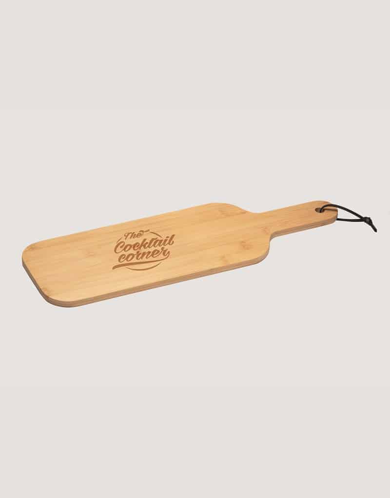 Tábua em bambu ideal para servir aperitivos, com fita para pendurar. Fornecida em luva de cartão. Certificação EU Food Grade. A cor e o resultado da impressão nos materiais naturais pode variar entre produtos.