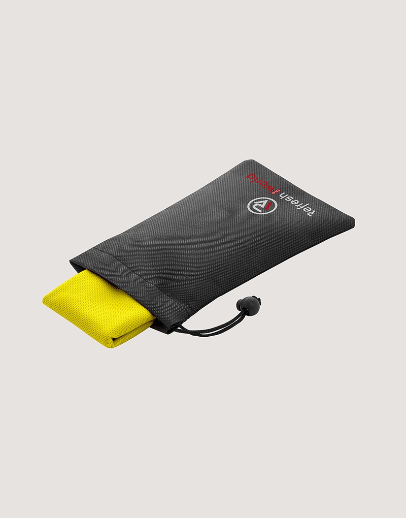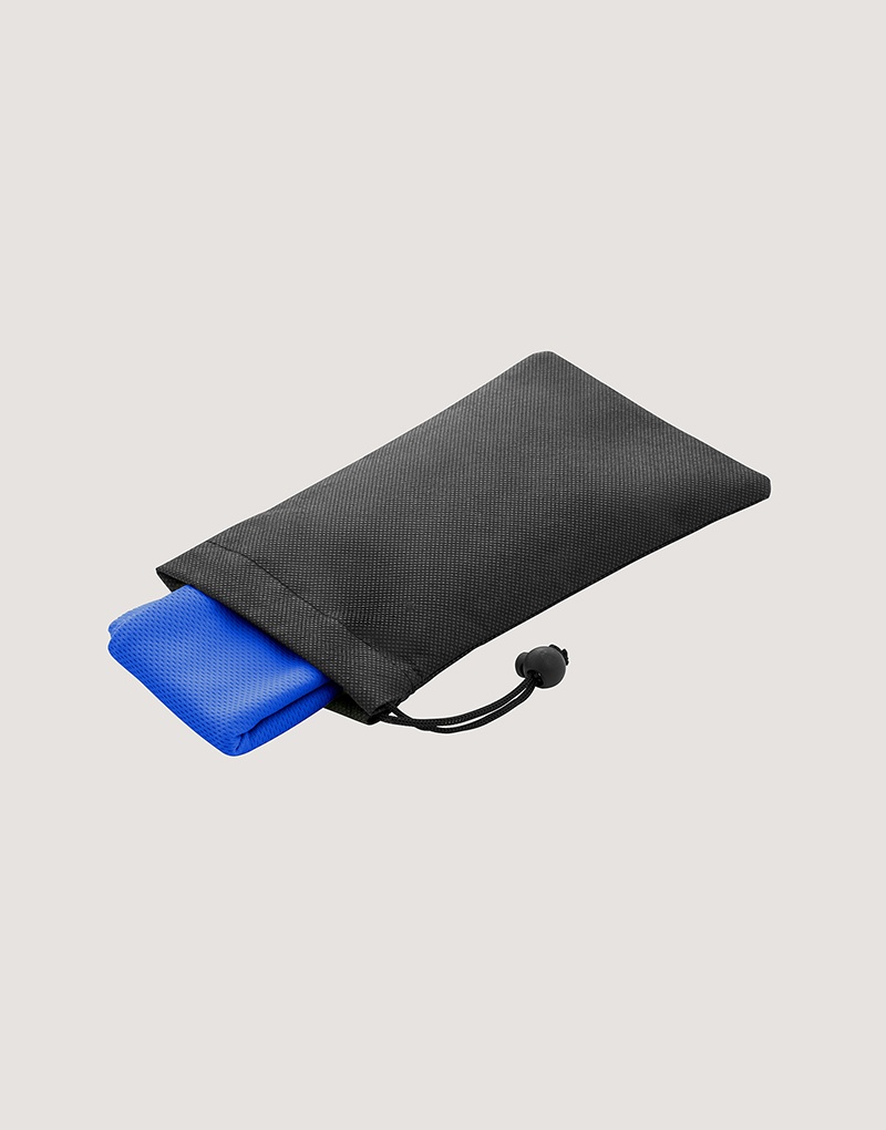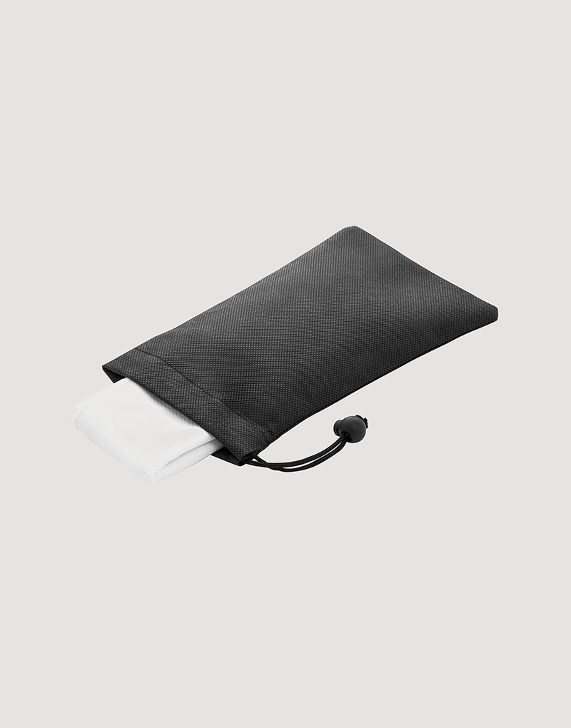Toalha esportiva refrescante em 100% poliéster reciclado (100% rPET). Toalha reutilizável, lavável na máquina de lavar roupa. Fornecida numa bolsa preta em non-woven.
