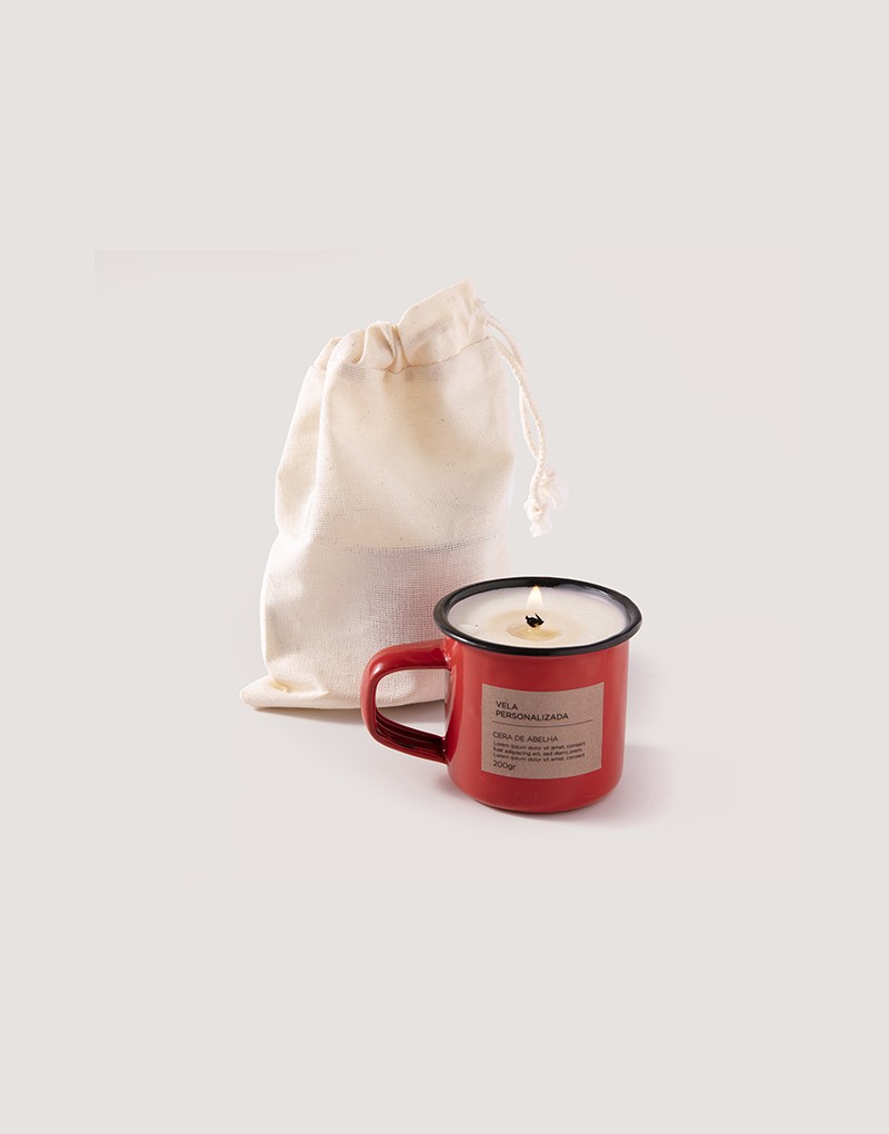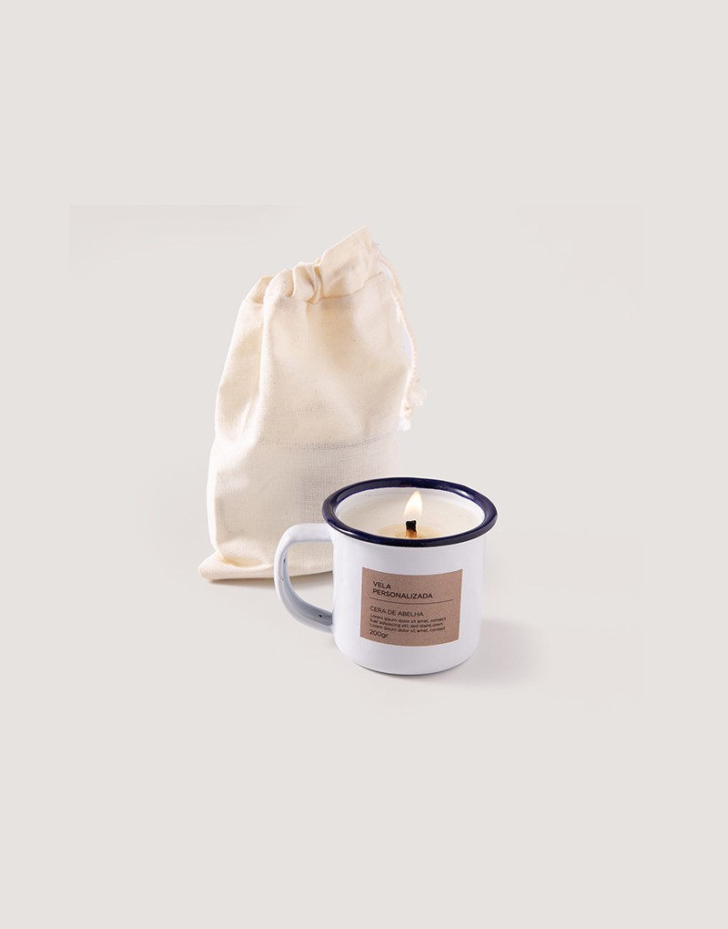Vela de cera branca em caneca de alumínio esmaltado, rótulo adesivo customizável. embalagem em saquinho de algodão cru com fechamento por cordão.